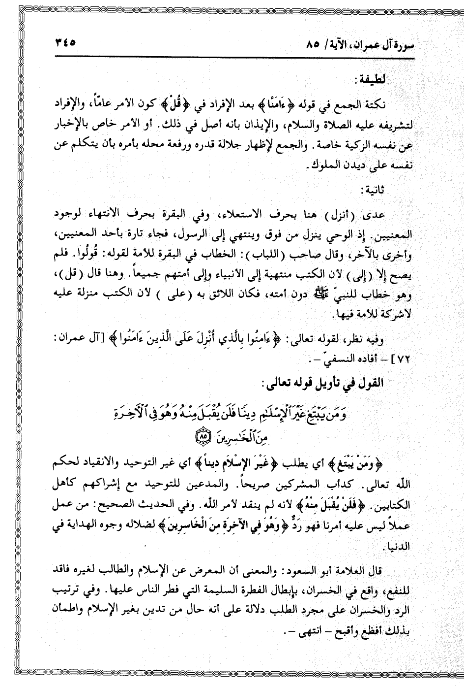 قال العلامة أبو السعود: والمعنى أن المعرض عن الإسلام والطالب لغيره فاقد للنفع، واقع في الخسران، بإبطال الفطرة السليمة التي فطر الناس عليها. وفي ترتيب الرد والخسران على مجرد الطلب دلالة على أنه حال من تدين بغير الإسلام واطمأن بذلك أفظع وأقبح- انتهى-.