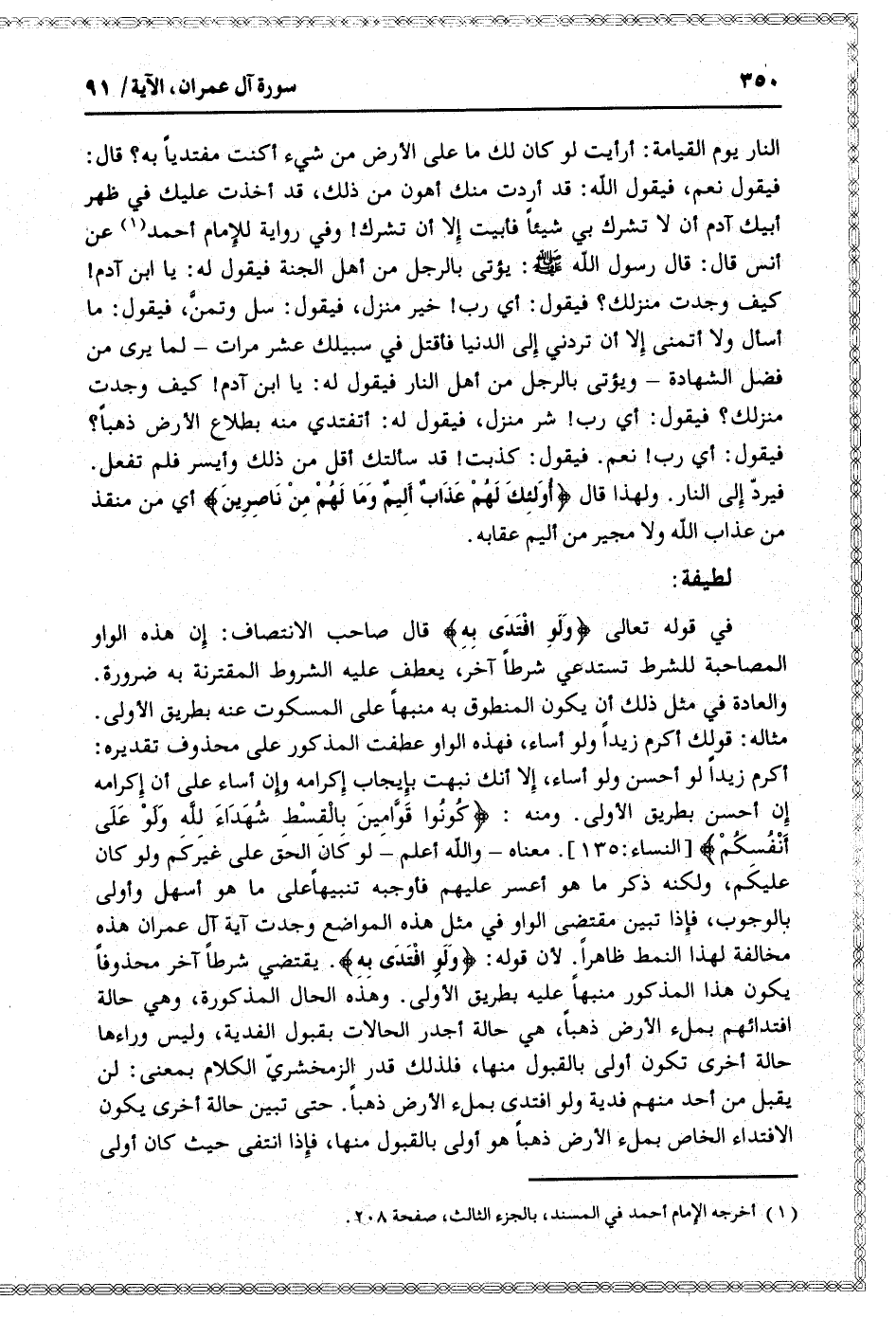 أكرم زيدا لو أحسن ولو أساء، إلا أنك نبهت بإيجاب إكرامه وإن أساء على أن إكرامه إن أحسن بطريق الأولى. ومنه: كُونُوا قَوَّامِينَ بِالْقِسْطِ شُهَداءَ لِلَّهِ وَلَوْ عَلى أَنْفُسِكُمْ [النساء: 135] . معناه- والله أعلم- لو كان الحق على غيركم ولو كان عليكم، ولكنه ذكر ما هو أعسر عليهم فأوجبه تنبيها على ما هو أسهل وأولى بالوجوب، فإذا تبين مقتضى الواو في مثل هذه المواضع وجدت آية آل عمران هذه مخالفة لهذا النمط ظاهرا. لأن قوله: وَلَوِ افْتَدى بِهِ. يقتضي شرطا آخر محذوفا يكون هذا المذكور منبها عليه بطريق الأولى. وهذه الحال المذكورة، وهي حالة افتدائهم بملء الأرض ذهبا، هي حالة أجدر الحالات بقبول الفدية، وليس وراءها حالة أخرى تكون أولى بالقبول منها، فلذلك قدر الزمخشريّ الكلام بمعنى: لن يقبل من أحد منهم فدية ولو افتدى بملء الأرض ذهبا. حتى تبين حالة أخرى يكون الافتداء الخاص بملء الأرض ذهبا هو أولى بالقبول منها، فإذا انتفى حيث كان أولى