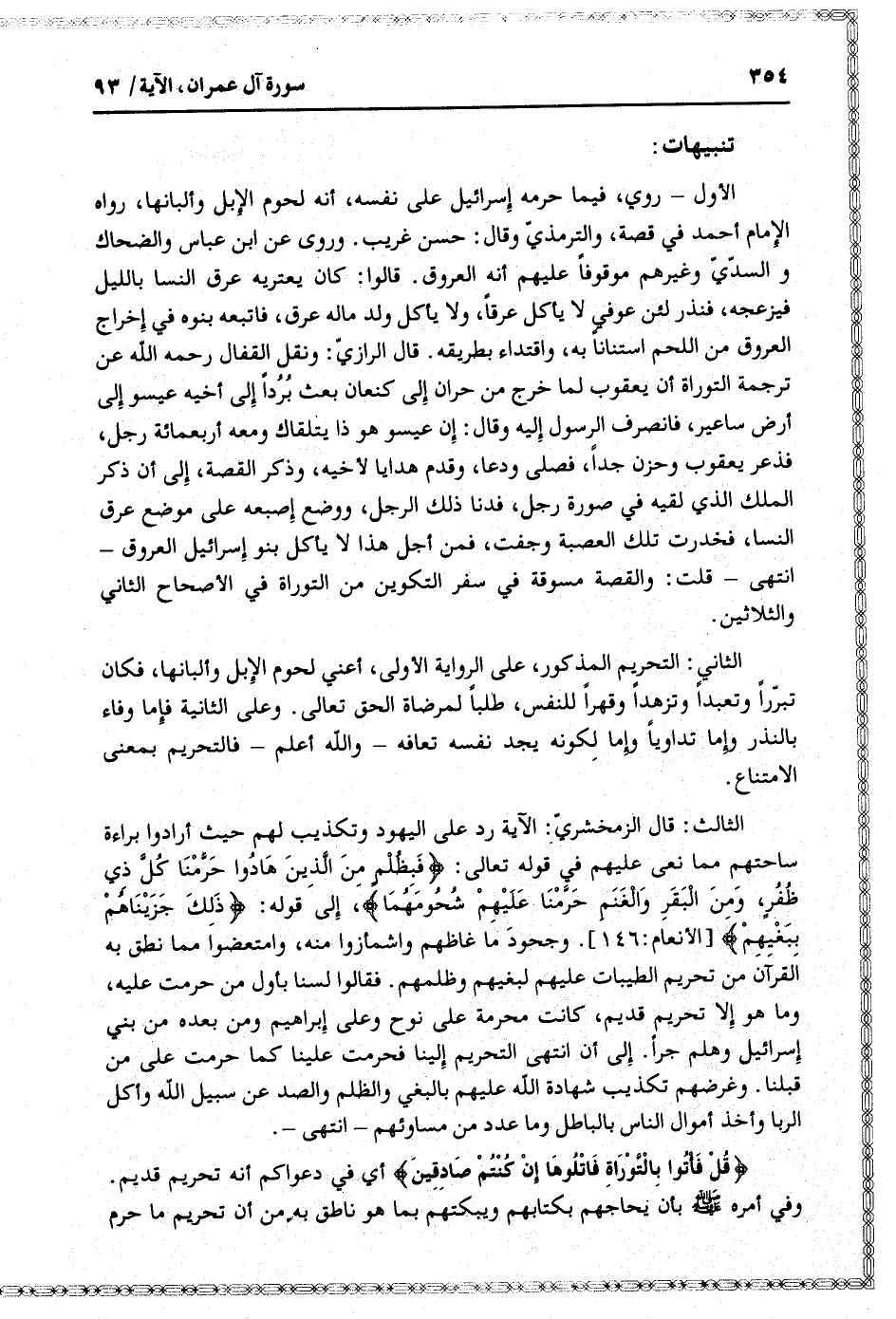 الأول- روي، فيما حرمه إسرائيل على نفسه، أنه لحوم الإبل وألبانها، رواه الإمام أحمد في قصة، والترمذيّ وقال: حسن غريب. وروى عن ابن عباس والضحاك والسدّيّ وغيرهم موقوفا عليهم أنه العروق. قالوا: كان يعتريه عرق النسا بالليل فيزعجه، فنذر لئن عوفي لا يأكل عرقا، ولا يأكل ولد ماله عرق، فاتبعه بنوه في إخراج العروق من اللحم استنانا به، واقتداء بطريقه. قال الرازيّ: ونقل القفال رحمه الله عن ترجمة التوراة أن يعقوب لما خرج من حران إلى كنعان بعث بردا إلى أخيه عيسو إلى أرض ساعير، فانصرف الرسول إليه وقال: إن عيسو هو ذا يتلقاك ومعه أربعمائة رجل، فذعر يعقوب وحزن جدا، فصلى ودعا، وقدم هدايا لأخيه، وذكر القصة، إلى أن ذكر الملك الذي لقيه في صورة رجل، فدنا ذلك الرجل، ووضع إصبعه على موضع عرق النسا، فخدرت تلك العصبة وجفت، فمن أجل هذا لا يأكل بنو إسرائيل العروق- انتهى- قلت: والقصة مسوقة في سفر التكوين من التوراة في الأصحاح الثاني والثلاثين.