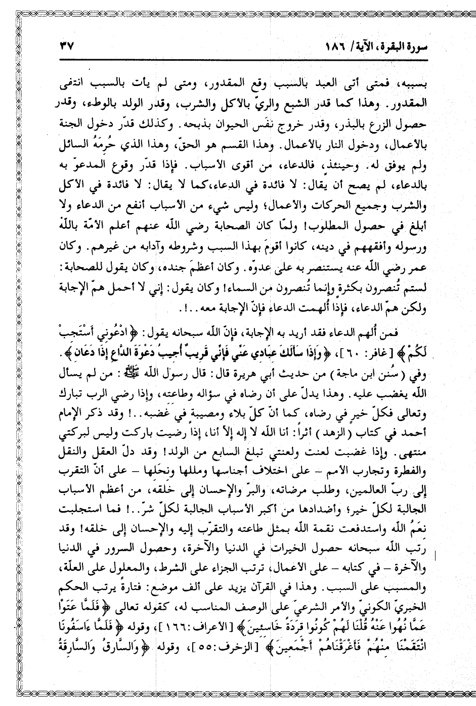 بسببه، فمتى أتى العبد بالسبب وقع المقدور، ومتى لم يأت بالسبب انتفى المقدور. وهذا كما قدر الشبع والريّ بالأكل والشرب، وقدر الولد بالوطء، وقدر حصول الزرع بالبذر، وقدر خروج نفس الحيوان بذبحه. وكذلك قدّر دخول الجنة بالأعمال، ودخول النار بالأعمال. وهذا القسم هو الحقّ، وهذا الذي حرمه السائل ولم يوفق له. وحينئذ، فالدعاء، من أقوى الأسباب. فإذا قدّر وقوع المدعوّ به بالدعاء، لم يصح أن يقال: لا فائدة في الدعاء، كما لا يقال: لا فائدة في الأكل والشرب وجميع الحركات والأعمال وليس شيء من الأسباب أنفع من الدعاء ولا أبلغ في حصول المطلوب! ولمّا كان الصحابة رضي الله عنهم أعلم الأمّة بالله ورسوله وأفقههم في دينه، كانوا أقوم بهذا السبب وشروطه وآدابه من غيرهم. وكان عمر رضي الله عنه يستنصر به على عدوّه. وكان أعظم جنده، وكان يقول للصحابة: