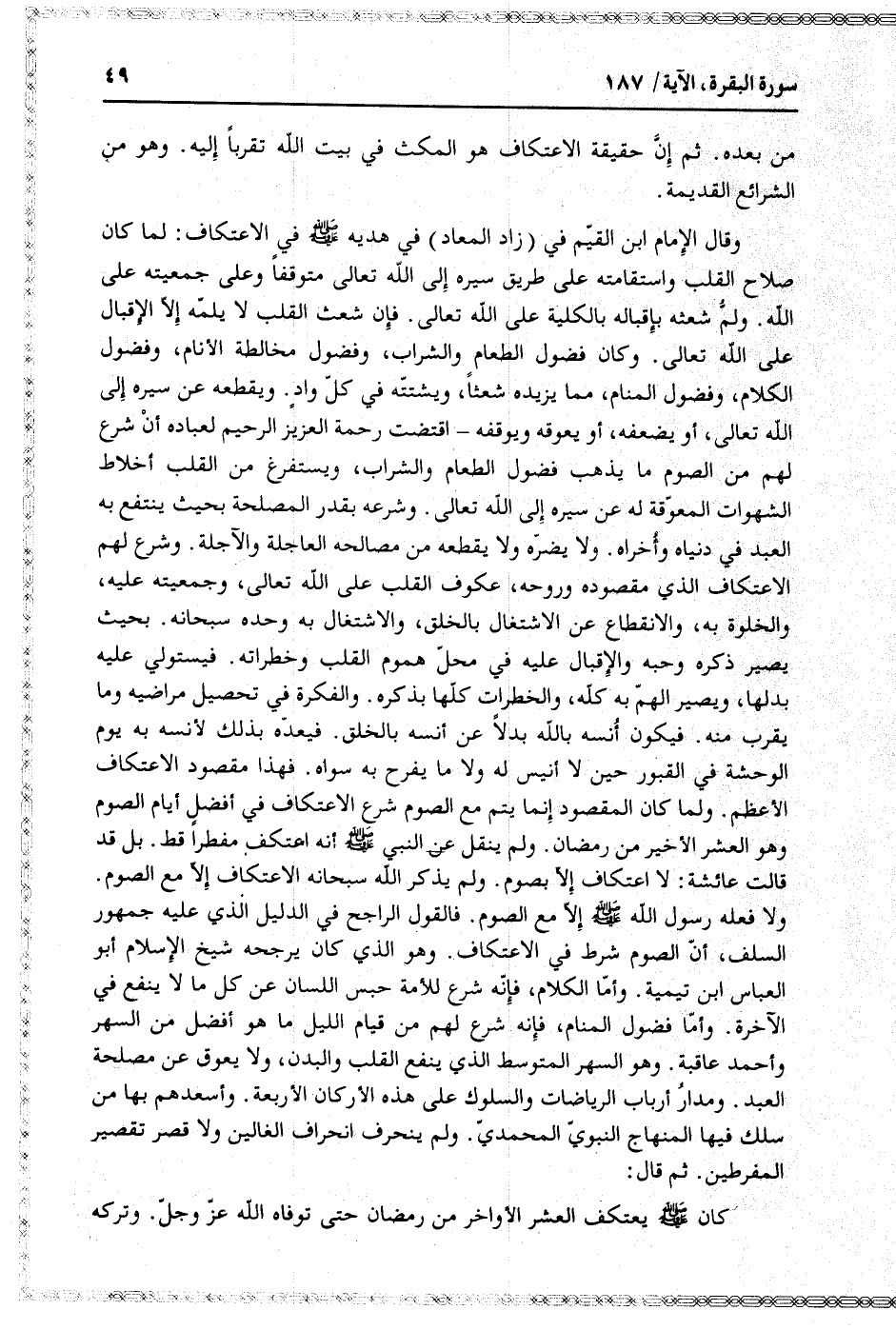 وقال الإمام ابن القيّم في (زاد المعاد) في هديه صلّى الله عليه وسلّم في الاعتكاف: لما كان صلاح القلب واستقامته على طريق سيره إلى الله تعالى متوقفا وعلى جمعيته على الله. ولمّ شعثه بإقباله بالكلية على الله تعالى. فإن شعث القلب لا يلمّه إلّا الإقبال على الله تعالى. وكان فضول الطعام والشراب، وفضول مخالطة الأنام، وفضول الكلام، وفضول المنام، مما يزيده شعثا، ويشتتّه في كلّ واد. ويقطعه عن سيره إلى الله تعالى، أو يضعفه، أو يعوقه ويوقفه- اقتضت رحمة العزيز الرحيم لعباده أن شرع لهم من الصوم ما يذهب فضول الطعام والشراب، ويستفرغ من القلب أخلاط الشهوات المعوّقة له عن سيره إلى الله تعالى. وشرعه بقدر المصلحة بحيث ينتفع به العبد في دنياه وأخراه. ولا يضرّه ولا يقطعه من مصالحه العاجلة والآجلة. وشرع لهم الاعتكاف الذي مقصوده وروحه، عكوف القلب على الله تعالى، وجمعيته عليه، والخلوة به، والانقطاع عن الاشتغال بالخلق، والاشتغال به وحده سبحانه. بحيث يصير ذكره وحبه والإقبال عليه في محلّ هموم القلب وخطراته. فيستولي عليه بدلها، ويصير الهمّ به كلّه، والخطرات كلّها بذكره. والفكرة في تحصيل مراضيه وما يقرب منه. فيكون أنسه بالله بدلا عن أنسه بالخلق. فيعدّه بذلك لأنسه به يوم الوحشة في القبور حين لا أنيس له ولا ما يفرح به سواه. فهذا مقصود الاعتكاف الأعظم. ولما كان المقصود إنما يتم مع الصوم شرع الاعتكاف في أفضل أيام الصوم وهو العشر الأخير من رمضان. ولم ينقل عن النبي صلّى الله عليه وسلّم أنه اعتكف مفطرا قط. بل قد قالت عائشة: لا اعتكاف إلّا بصوم. ولم يذكر الله سبحانه الاعتكاف إلّا مع الصوم.