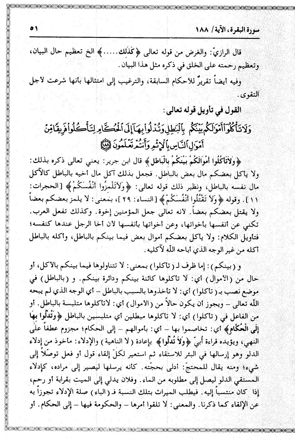 وَلا تَأْكُلُوا أَمْوالَكُمْ بَيْنَكُمْ بِالْباطِلِ وَتُدْلُوا بِها إِلَى الْحُكَّامِ لِتَأْكُلُوا فَرِيقاً مِنْ أَمْوالِ النَّاسِ بِالْإِثْمِ وَأَنْتُمْ تَعْلَمُونَ (188)