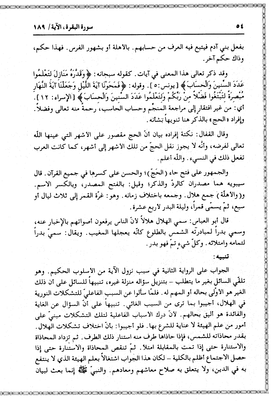 الجواب على الرواية الثانية في سبب نزول الآية من الأسلوب الحكيم. وهو تلقّي السائل بغير ما يتطلب- بتنزيل سؤاله منزلة غيره، تنبيها للسائل على أن ذلك الغير هو الأولى بحاله أو المهم له. فلمّا سألوا عن السبب الفاعليّ للتشكلات النورية في الهلال، أجيبوا بما ترى من السبب الغائي. تنبيها على أنّ السؤال عن الغاية والفائدة هو أليق بحالهم. لأنّ درك الأسباب الفاعلية لتلك التشكلات مبنيّ على أمور من علم الهيئة لا عناية للشرع بها. فلو أجيبوا: بأنّ اختلاف تشكلات الهلال.