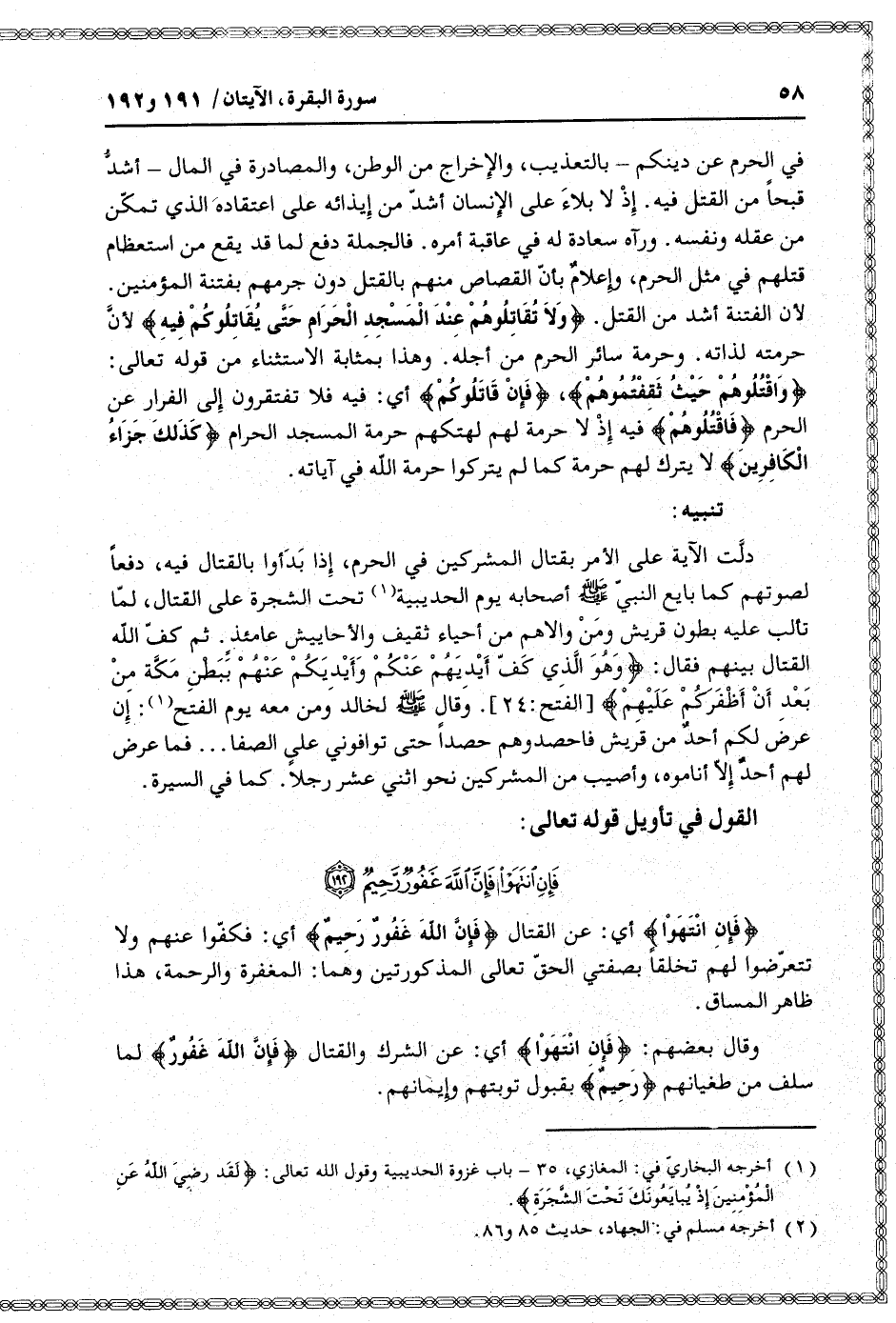 لأن الفتنة أشد من القتل. وَلا تُقاتِلُوهُمْ عِنْدَ الْمَسْجِدِ الْحَرامِ حَتَّى يُقاتِلُوكُمْ فِيهِ لأنّ حرمته لذاته. وحرمة سائر الحرم من أجله. وهذا بمثابة الاستثناء من قوله تعالى: