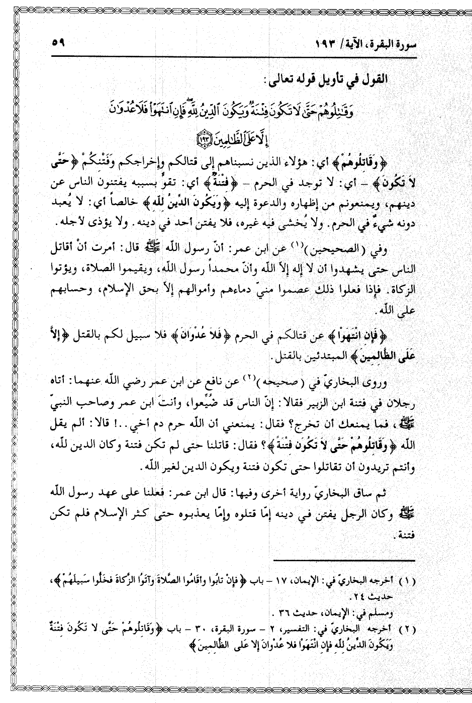 (2) أخرجه البخاريّ في: التفسير، 2- سورة البقرة، 30- باب وَقاتِلُوهُمْ حَتَّى لا تَكُونَ فِتْنَةٌ وَيَكُونَ الدِّينُ لِلَّهِ فَإِنِ انْتَهَوْا فَلا عُدْوانَ إِلَّا عَلَى الظَّالِمِينَ.