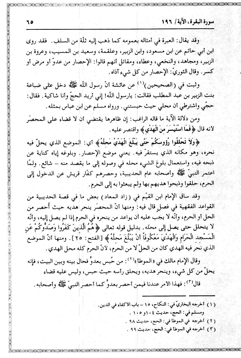 وقد ساق الإمام ابن القيّم في (زاد المعاد) بعض ما في قصة الحديبية من القواعد الفقهية في فصل قال فيه: ومنها أنّ المحصر ينحر هديه حيث أحصر من الحل أو الحرم، وأنّه لا يجب عليه أن يواعد من ينحره في الحرم إذا لم يصل إليه، وأنّه لا يتحلل حتى يصل إلى محله. بدليل قوله تعالى هُمُ الَّذِينَ كَفَرُوا وَصَدُّوكُمْ عَنِ الْمَسْجِدِ الْحَرامِ وَالْهَدْيَ مَعْكُوفاً أَنْ يَبْلُغَ مَحِلَّهُ [الفتح: 25] . ومنها أنّ الموضع الذي نحر فيه الهدي كان من الحلّ لا من الحرم، لأنّ الحرم كله محل الهدي.