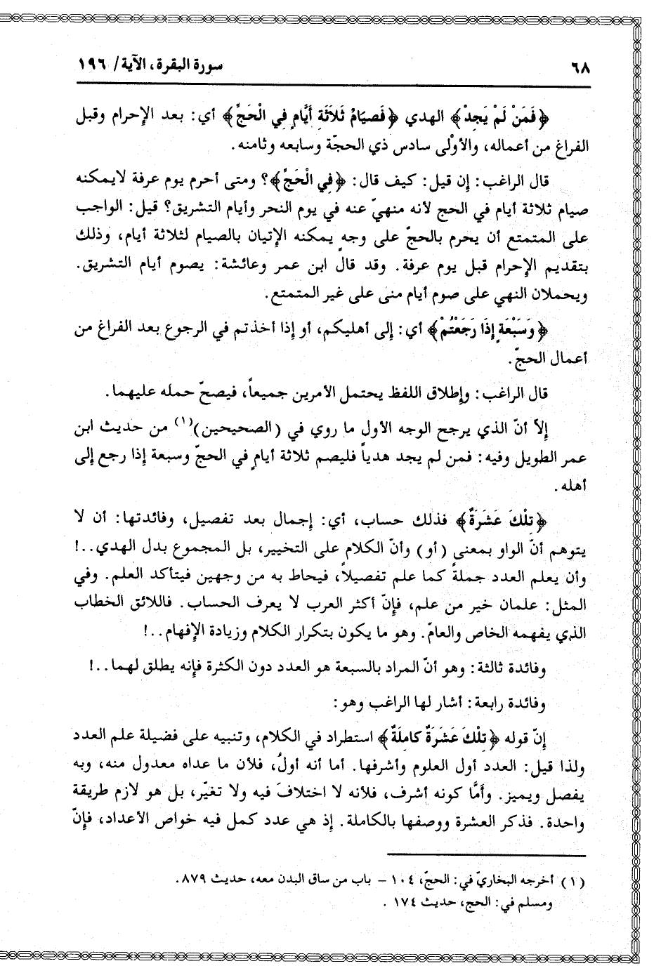 إنّ قوله تِلْكَ عَشَرَةٌ كامِلَةٌ استطراد في الكلام، وتنبيه على فضيلة علم العدد ولذا قيل: العدد أول العلوم وأشرفها. أما أنه أول، فلأن ما عداه معدول منه، وبه يفصل ويميز. وأمّا كونه أشرف، فلأنه لا اختلاف فيه ولا تغيّر، بل هو لازم طريقة واحدة. فذكر العشرة ووصفها بالكاملة. إذ هي عدد كمل فيه خواص الأعداد، فإنّ