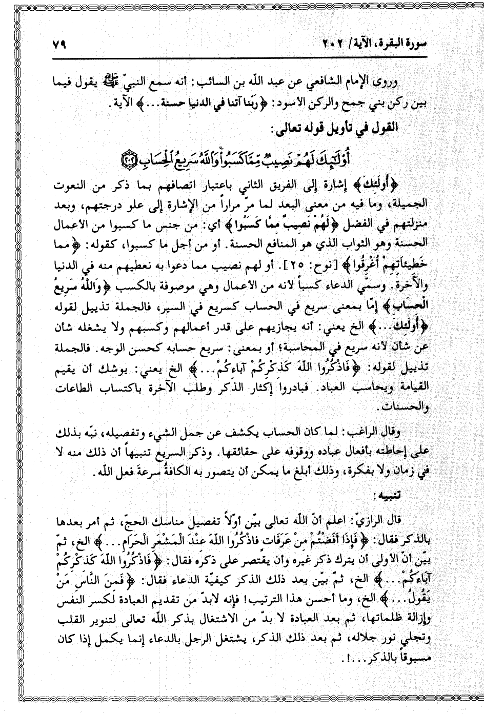 أُولئِكَ إشارة إلى الفريق الثاني باعتبار اتصافهم بما ذكر من النعوت الجميلة، وما فيه من معنى البعد لما مرّ مرارا من الإشارة إلى علو درجتهم، وبعد منزلتهم في الفضل لَهُمْ نَصِيبٌ مِمَّا كَسَبُوا أي: من جنس ما كسبوا من الأعمال الحسنة وهو الثواب الذي هو المنافع الحسنة. أو من أجل ما كسبوا، كقوله: مِمَّا خَطِيئاتِهِمْ أُغْرِقُوا [نوح: 25] . أو لهم نصيب مما دعوا به نعطيهم منه في الدنيا والآخرة. وسمّي الدعاء كسبا لأنه من الأعمال وهي موصوفة بالكسب وَاللَّهُ سَرِيعُ الْحِسابِ إمّا بمعنى سريع في الحساب كسريع في السير، فالجملة تذييل لقوله أُولئِكَ ... إلخ يعني: أنه يجازيهم على قدر أعمالهم وكسبهم ولا يشغله شأن عن شأن لأنه سريع في المحاسبة أو بمعنى: سريع حسابه كحسن الوجه. فالجملة تذييل لقوله: فَاذْكُرُوا اللَّهَ كَذِكْرِكُمْ آباءَكُمْ ... إلخ يعني: يوشك أن يقيم القيامة ويحاسب العباد. فبادروا إكثار الذكر وطلب الآخرة باكتساب الطاعات والحسنات.