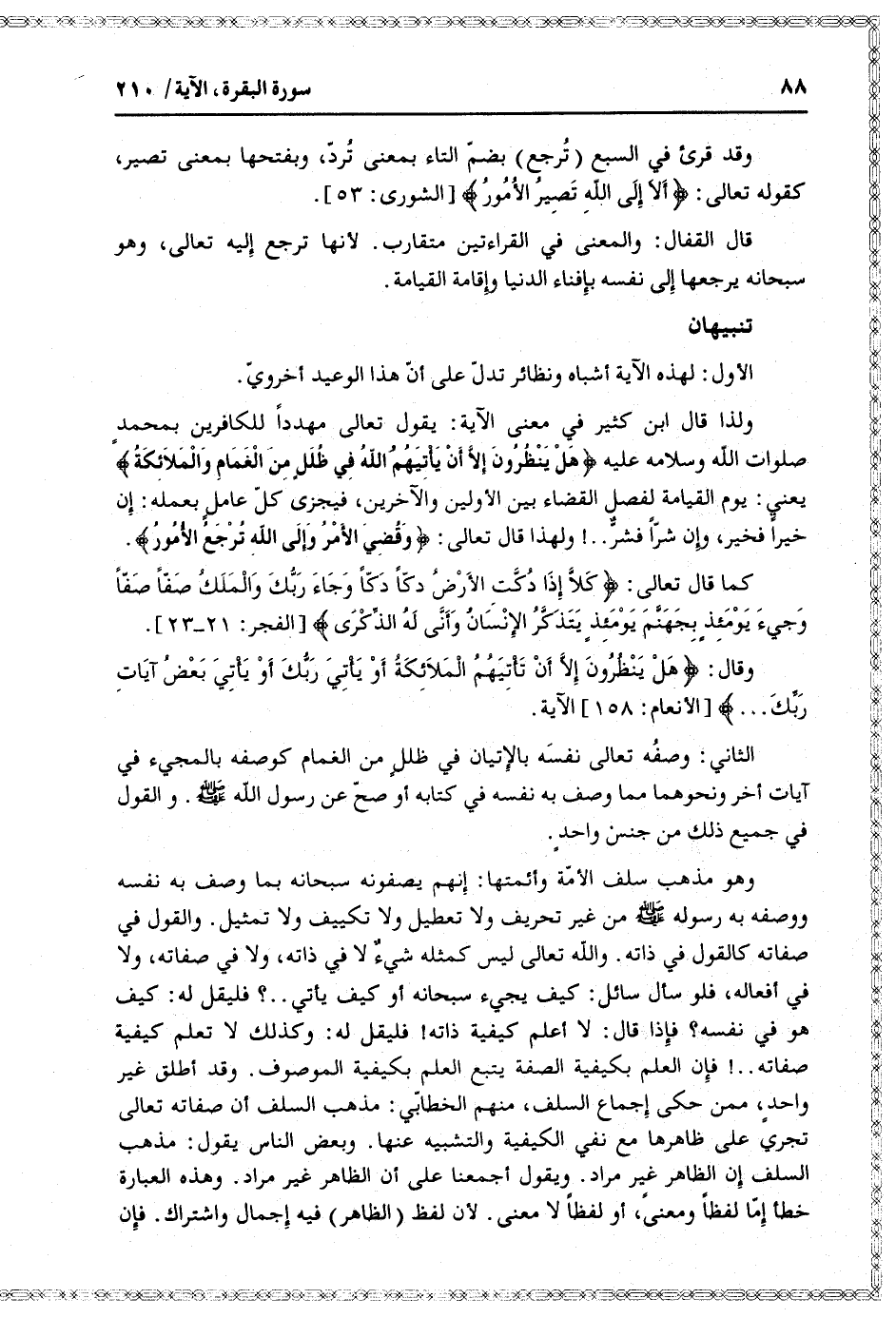 الثاني: وصفه تعالى نفسه بالإتيان في ظلل من الغمام كوصفه بالمجيء في آيات أخر ونحوهما مما وصف به نفسه في كتابه أو صحّ عن رسول الله صلى الله عليه وسلم. والقول في جميع ذلك من جنس واحد.