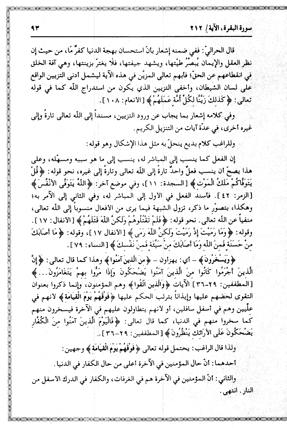 [المطففين: 29- 36] الآيات وَالَّذِينَ اتَّقَوْا وهم المؤمنون، وإنما ذكروا بعنوان التقوى لحضهم عليها وإيذانا بترتب الحكم عليها فَوْقَهُمْ يَوْمَ الْقِيامَةِ لأنهم في علّيين وهم في أسفل سافلين، أو لأنهم يتطاولون عليهم في الآخرة فيسخرون منهم كما سخروا منهم في الدنيا، كما قال تعالى: فَالْيَوْمَ الَّذِينَ آمَنُوا مِنَ الْكُفَّارِ يَضْحَكُونَ عَلَى الْأَرائِكِ يَنْظُرُونَ [المطففين: 29- 36] .