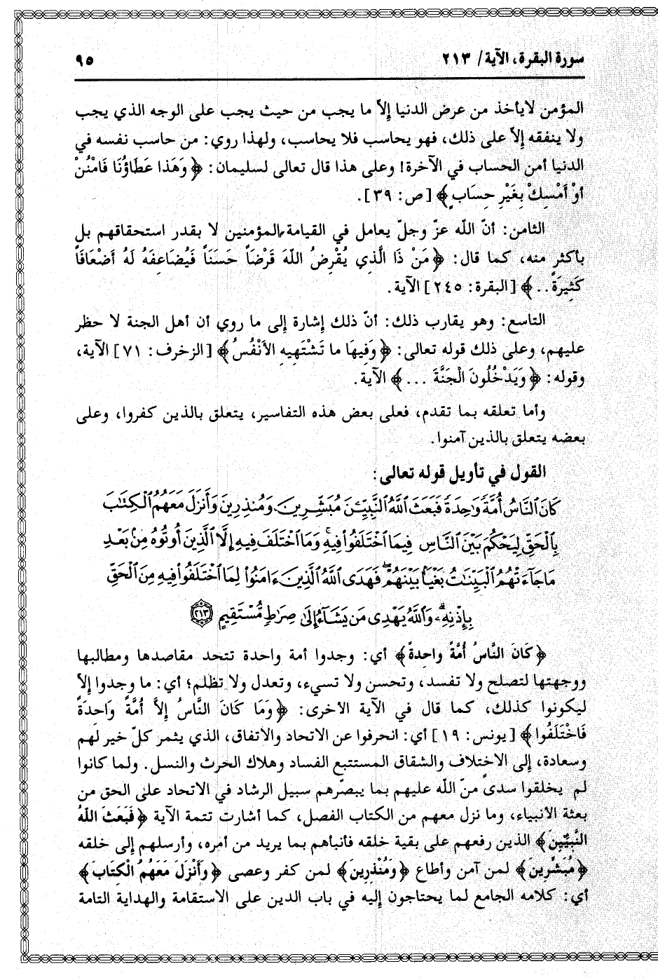 كانَ النَّاسُ أُمَّةً واحِدَةً فَبَعَثَ اللَّهُ النَّبِيِّينَ مُبَشِّرِينَ وَمُنْذِرِينَ وَأَنْزَلَ مَعَهُمُ الْكِتابَ بِالْحَقِّ لِيَحْكُمَ بَيْنَ النَّاسِ فِيمَا اخْتَلَفُوا فِيهِ وَمَا اخْتَلَفَ فِيهِ إِلاَّ الَّذِينَ أُوتُوهُ مِنْ بَعْدِ ما جاءَتْهُمُ الْبَيِّناتُ بَغْياً بَيْنَهُمْ فَهَدَى اللَّهُ الَّذِينَ آمَنُوا لِمَا اخْتَلَفُوا فِيهِ مِنَ الْحَقِّ بِإِذْنِهِ وَاللَّهُ يَهْدِي مَنْ يَشاءُ إِلى صِراطٍ مُسْتَقِيمٍ (213)