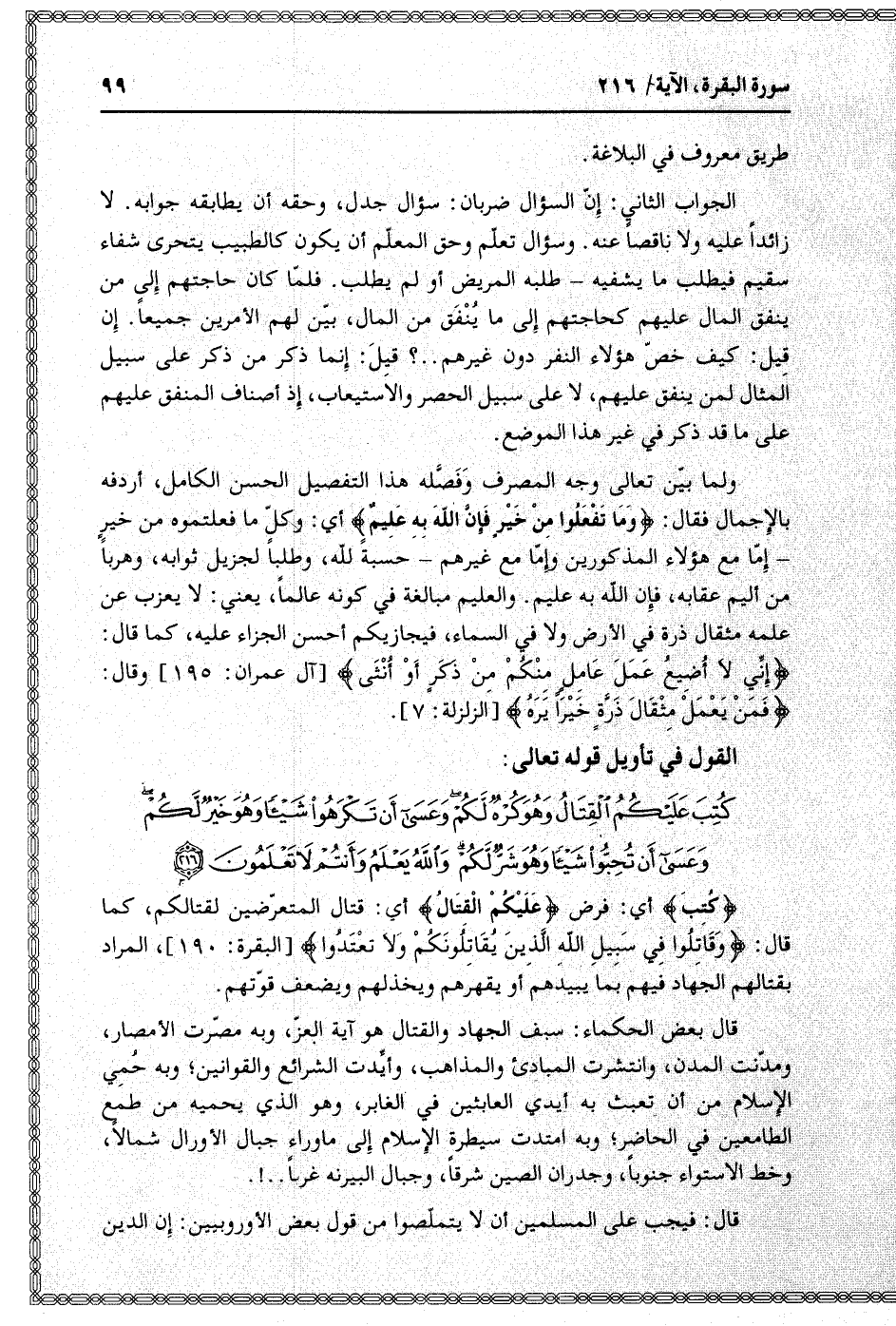كُتِبَ عَلَيْكُمُ الْقِتالُ وَهُوَ كُرْهٌ لَكُمْ وَعَسى أَنْ تَكْرَهُوا شَيْئاً وَهُوَ خَيْرٌ لَكُمْ وَعَسى أَنْ تُحِبُّوا شَيْئاً وَهُوَ شَرٌّ لَكُمْ وَاللَّهُ يَعْلَمُ وَأَنْتُمْ لا تَعْلَمُونَ (216)