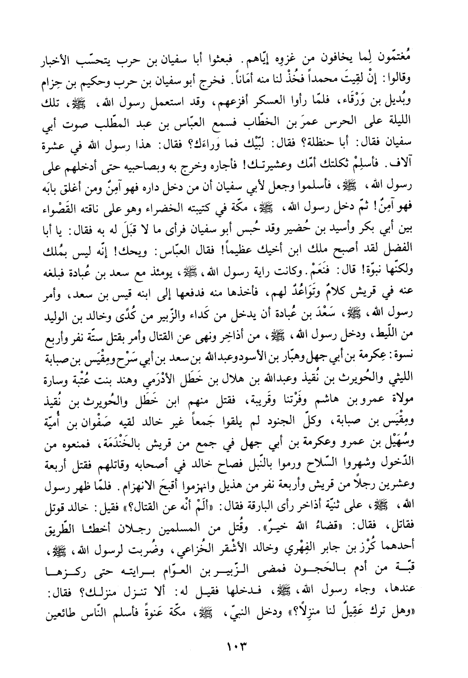 مغتمون لما يخافون مِن غزوه إياهم. فبعثوا أَبَا سُفْيَان بْن حرب يتحسب الأخبار وقالوا: إن لقيت محمدا فخذ لنا منه أمانا فخرج أَبُو سُفْيَان بْن حرب وحكيم بْن حزام وبديل بْن ورقاء. فلما رأوا العسكر أفزعهم. وقد اسْتَعْمَلَ رَسُول اللَّهِ - صَلَّى اللَّهُ عَلَيْهِ وَسَلَّمَ - تلك الليلة عَلَى الحرس عُمَر بْن الْخَطَّاب فسمع الْعَبَّاس بْن عَبْد المطلب صوت أَبِي سُفْيَان فَقَالَ: أَبَا حنظلة؟ فَقَالَ: لبيك فما وراءك؟ فَقَالَ: هذا رَسُول اللَّهِ فِي عشرة آلاف. فأسلم ثكلتك أمك وعشيرتك! فأجاره وخرج بِهِ وبصاحبيه حتى أدخلهم عَلَى رسول الله - صلى الله عليه وسلم - فأسلموا وجعل لأبي سُفْيَان أن مِن دخل داره فَهُوَ آمِنٌ وَمَنْ أَغْلَقَ بَابَهُ فَهُوَ آمِنٌ! ثم دَخَلَ رَسُولُ اللَّهِ - صَلَّى اللَّهُ عَلَيْهِ وَسَلَّمَ - مكّة فِي كتيبته الخضراء وهو عَلَى ناقته القصواء بين أَبِي بَكْر وأسيد بْن حضير وقد حُبس أبو سُفْيَان فرأى ما لا قبل لَهُ بِهِ فَقَالَ: يا أبا الفضل لقد أصبح ملك ابن أخيك عظيما! فَقَالَ الْعَبَّاس: ويحك! إنه لَيْسَ بملك ولكنها نبوة! قَالَ: فنعم. وكانت رَايَةِ رَسُولِ اللَّهِ - صَلَّى اللَّهُ عَلَيْهِ وَسَلَّمَ - يومئذ مَعَ سعد بْن عبادة فبلغه عَنْهُ فِي قريش كلام وتواعد لهم. فأخذها منه فدفعها إلى ابنه قيس بْن سعد. وَأَمَرَ رَسُول اللَّهِ - صَلَّى اللَّهُ عَلَيْهِ وَسَلَّمَ - سَعْدَ بْن عبادة أن يدخل مِن كداء والزبير مِن كدى وخالد بْن الوليد مِن الليط. وَدَخَلَ رَسُول اللَّهِ - صَلَّى اللَّهُ عَلَيْهِ وَسَلَّمَ - مِن أذاخر ونهى عَن القتال وأمر بقتل ستة نفر وأربع نسوة: عكرمة بْن أَبِي جهل وهبار بْن الأسود وَعَبْد اللَّه بْن سعد بْن أَبِي سرح ومقيس بْن صبابة الليثي والحويرث بْن نقيذ وَعَبْد اللَّه بْن هلال بْن خطل الأدرمي وهند بِنْت عتبة وسارة مولاة عَمْرو بْن هاشم وفرتنا وقريبة. فقتل منهم ابن خطل والحويرث بن نقيذ ومقيس بْن صبابة. وكل الجنود لم يلقوا جمعا غير خالد لقيه صفوان بْن أُميّة وَسُهَيْلُ بْن عَمْرو وَعِكْرِمَةُ بْن أَبِي جَهْلٍ فِي جمع مِن قريش بالخندمة. فمنعوه مِن الدخول وشهروا السلاح ورموا بِالنَّبْلِ فَصَاحَ خَالِدٌ فِي أَصْحَابِهِ وَقَاتَلَهُمْ فَقَتَلَ أربعة وعشرين رجلا مِن قريش وأربعة نفر مِن هذيل وانهزموا أقبح الانهزام. فلما ظهر رسول الله - صلى الله عليه وسلم - على ثنية أذاخر رَأَى البارقة [فَقَالَ: ألم أنه عَن القتال؟ فقيل: خالد قوتل فقاتل. فَقَالَ: قضاء اللَّه خير] . وقتل مِن المسلمين رجلان أخطئا الطريق أحدهما كرز بْن جَابِر الْفِهْريّ وخالد الأشعر الخزاعي. وضربت لرسول اللَّه - صَلَّى اللَّهُ عَلَيْهِ وَسَلَّمَ -
