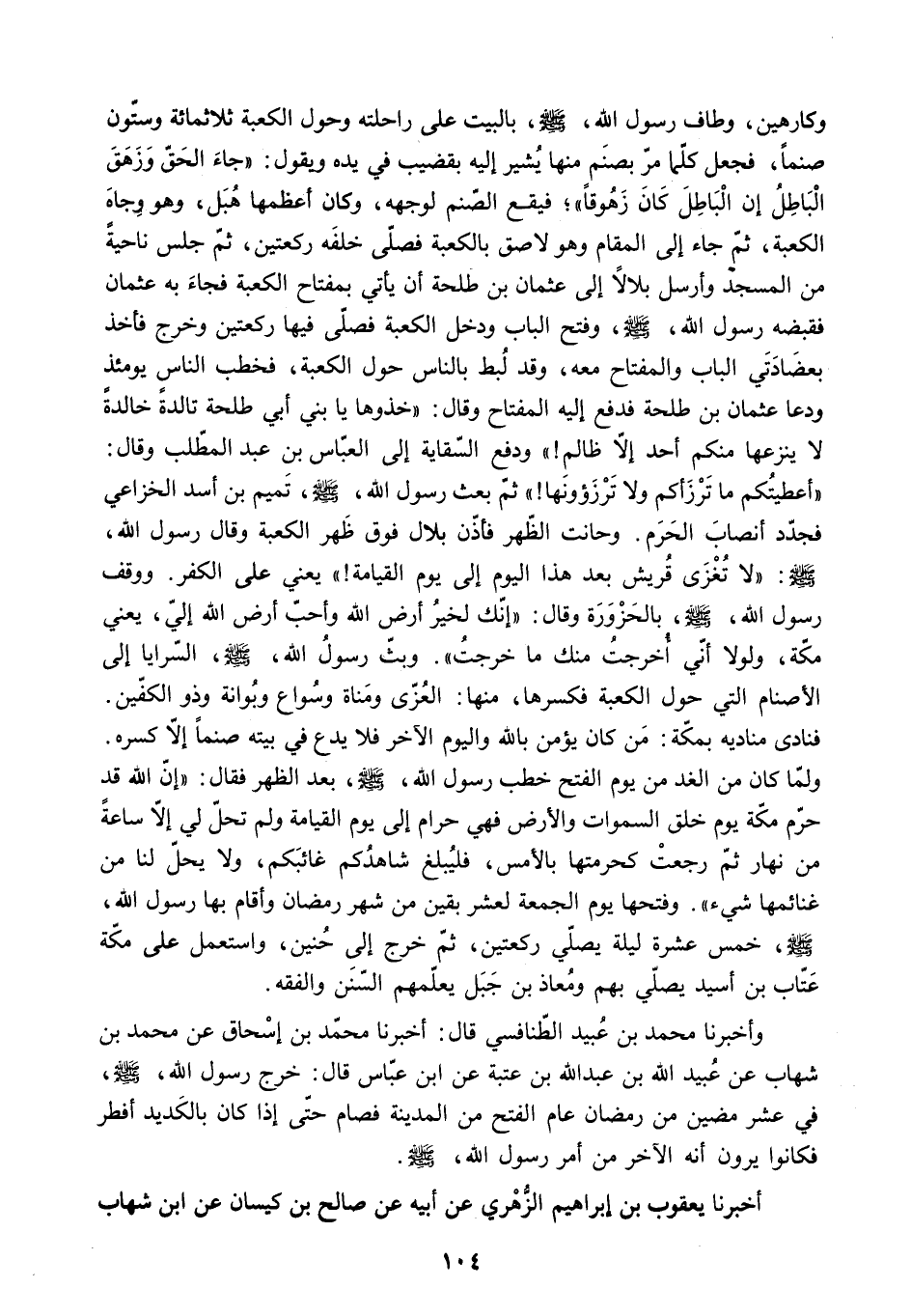 وكارهين. وطاف رَسُول اللَّهِ - صَلَّى اللَّهُ عَلَيْهِ وَسَلَّمَ - بالبيت عَلَى راحلته وحول الكعبة ثلاثمائة وستون صنما. فجعل كلما مر بصنم منها يشير إِلَيْهِ بقضيب فِي يده ويقول: جاءَ الْحَقُّ وَزَهَقَ الْباطِلُ إِنَّ الْباطِلَ كانَ زَهُوقاً] . فيقع الصنم لوجهه. وكان أعظمها هبل. وهو وجاه الكعبة. ثُمَّ جاء إلى المقام وهو لاصق بالكعبة فصلى خلفه ركعتين. ثُمَّ جلس ناحية مِن المسجد وأرسل بلالا إلى عثمان بْن طلحة أن يأتي بمفتاح الكعبة فجاء بِهِ عثمان فقبضه رَسُول اللَّهِ - صَلَّى اللَّهُ عَلَيْهِ وَسَلَّمَ - وفتح الباب ودخل الكعبة فصلى فيها ركعتين وخرج فأخذ بعضادتي الباب والمفتاح معه. وقد لبط بالناس حول الكعبة. فخطب النّاس يومئذ ودعا عثمان بْن طلحة فدفع إليه المفتاح وقال: [خذوها يا بني أَبِي طلحة تالدة خالدة لا ينزعها منكم أحد إلا ظالم! ودفع السقاية] إلى العباس بن عبد المطلب وقال: