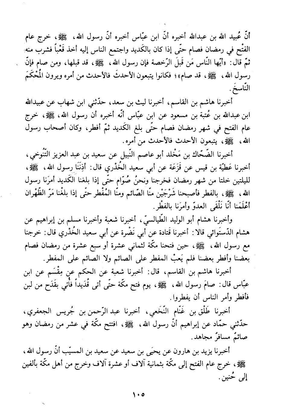 أَخْبَرَنَا هَاشِمُ بْنُ الْقَاسِمِ. أَخْبَرَنَا لَيْثُ بْنُ سَعْدٍ. حَدَّثَنِي ابْنُ شِهَابٍ عَنْ عُبَيْدِ الله ابن عَبْدِ اللَّهِ بْنِ عُتْبَةَ بْنِ مَسْعُودٍ عَنِ ابْنِ عَبَّاسٍ أَنَّهُ أَخْبَرَهُ أَنَّ رَسُولَ اللَّهِ - صَلَّى اللَّهُ عَلَيْهِ وَسَلَّمَ - خَرَجَ عَامَ الْفَتْحِ فِي شَهْرِ رَمَضَانَ فَصَامَ حَتَّى بَلَغَ الْكَدِيدَ ثُمَّ أَفْطَرَ. وَكَانَ أَصْحَابُ رَسُولِ اللَّهِ - صَلَّى اللَّهُ عَلَيْهِ وَسَلَّمَ - يَتَّبِعُونَ الأَحْدَثَ فَالأَحْدَثَ مِنْ أَمْرِهِ.