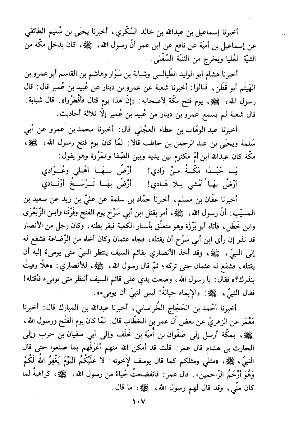 أَخْبَرَنَا أَحْمَدُ بْنُ الْحَجَّاجِ الْخُرَاسَانِيُّ. أَخْبَرَنَا عَبْدُ اللَّهِ بْنُ الْمُبَارَكِ قَالَ: أَخْبَرَنَا معمر عن الزُّهْرِيِّ عَنْ بَعْضِ آلِ عُمَرَ بْنِ الْخَطَّابِ قَالَ: لَمَّا كَانَ يَوْمَ الْفَتْحِ وَرَسُولُ اللَّهِ.