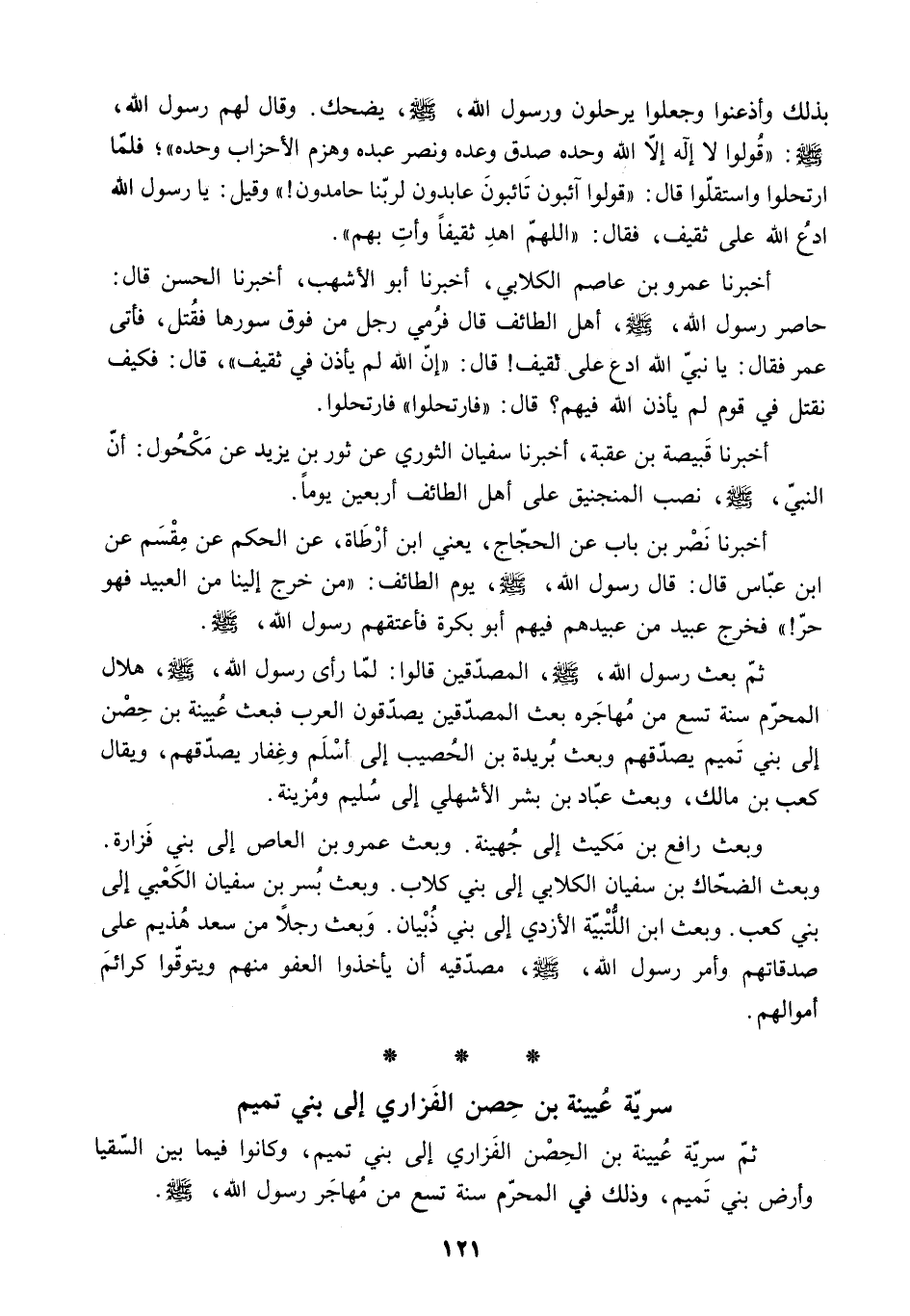 ثُمَّ سرية عيينة بْن الحصن الفزاري إلى بني تميم. وكانوا فيما بين السقيا وأرض بني تميم. وذلك فِي المحرَّم سنة تسع من مهاجر رَسُولِ اللَّهِ - صَلَّى اللَّهُ عَلَيْهِ وَسَلَّمَ -