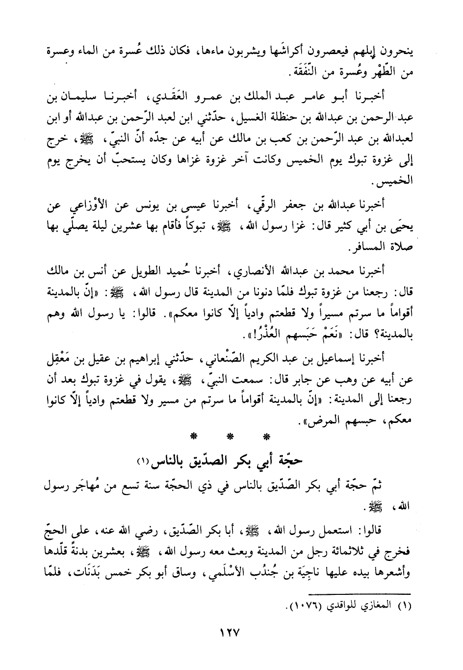 ثُمَّ حجة أَبِي بَكْر الصديق بالناس فِي ذي الحجّة سنة تسع من مهاجر رَسُول اللَّهِ - صَلَّى اللَّهُ عَلَيْهِ وَسَلَّمَ -