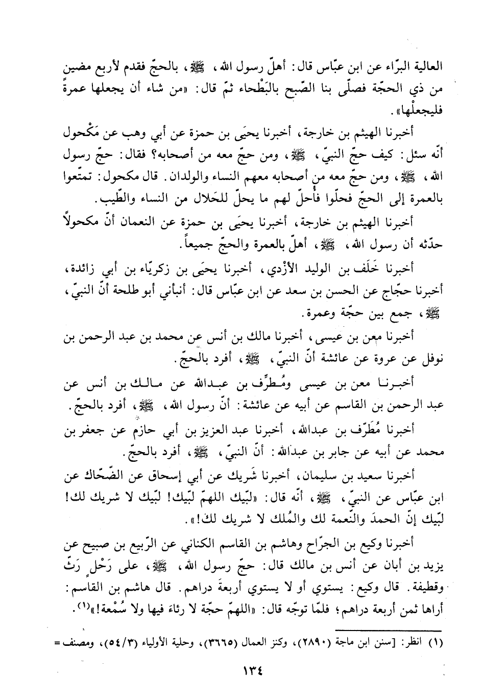 أَخْبَرَنَا سَعِيدُ بْنُ سُلَيْمَانَ. أَخْبَرَنَا شَرِيكٌ عَنْ أَبِي إِسْحَاقَ عَنِ الضَّحَّاكِ عَنِ ابْنِ عَبَّاسٍ [عَنِ النَّبِيِّ - صَلَّى اللَّهُ عَلَيْهِ وَسَلَّمَ - أَنَّهُ قَالَ: لَبَّيْكَ اللَّهُمَّ لَبَّيْكَ! لَبَّيْكَ لا شَرِيكَ لَكَ! لَبَّيْكَ إِنَّ الْحَمْدَ وَالنِّعْمَةَ لَكَ وَالْمُلْكَ لا شَرِيكَ لَكَ!] .