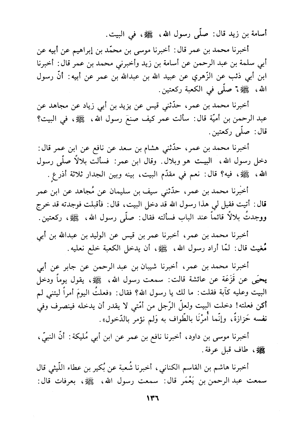 أَخْبَرَنَا مُحَمَّدُ بْنُ عُمَرَ قَالَ: أَخْبَرَنَا مُوسَى بْنُ مُحَمَّدِ بْنِ إِبْرَاهِيمَ عَنْ أَبِيهِ عَنْ أَبِي سَلَمَةَ بْنِ عَبْدِ الرَّحْمَنِ عَنْ أُسَامَةَ بْنِ زَيْدٍ وَأَخْبَرَنِي مُحَمَّدُ بْنُ عُمَرَ قَالَ: أَخْبَرَنَا ابْنُ أَبِي ذِئْبٍ عَنِ الزُّهْرِيِّ عَنْ عُبَيْدِ اللَّهِ بْنِ عَبْدِ اللَّهِ بْنِ عُمَرَ عَنْ أَبِيهِ: أَنَّ رَسُولَ اللَّهِ - صَلَّى اللَّهُ عليه وسلم - صَلَّى فِي الْكَعْبَةِ رَكْعَتَيْنِ.