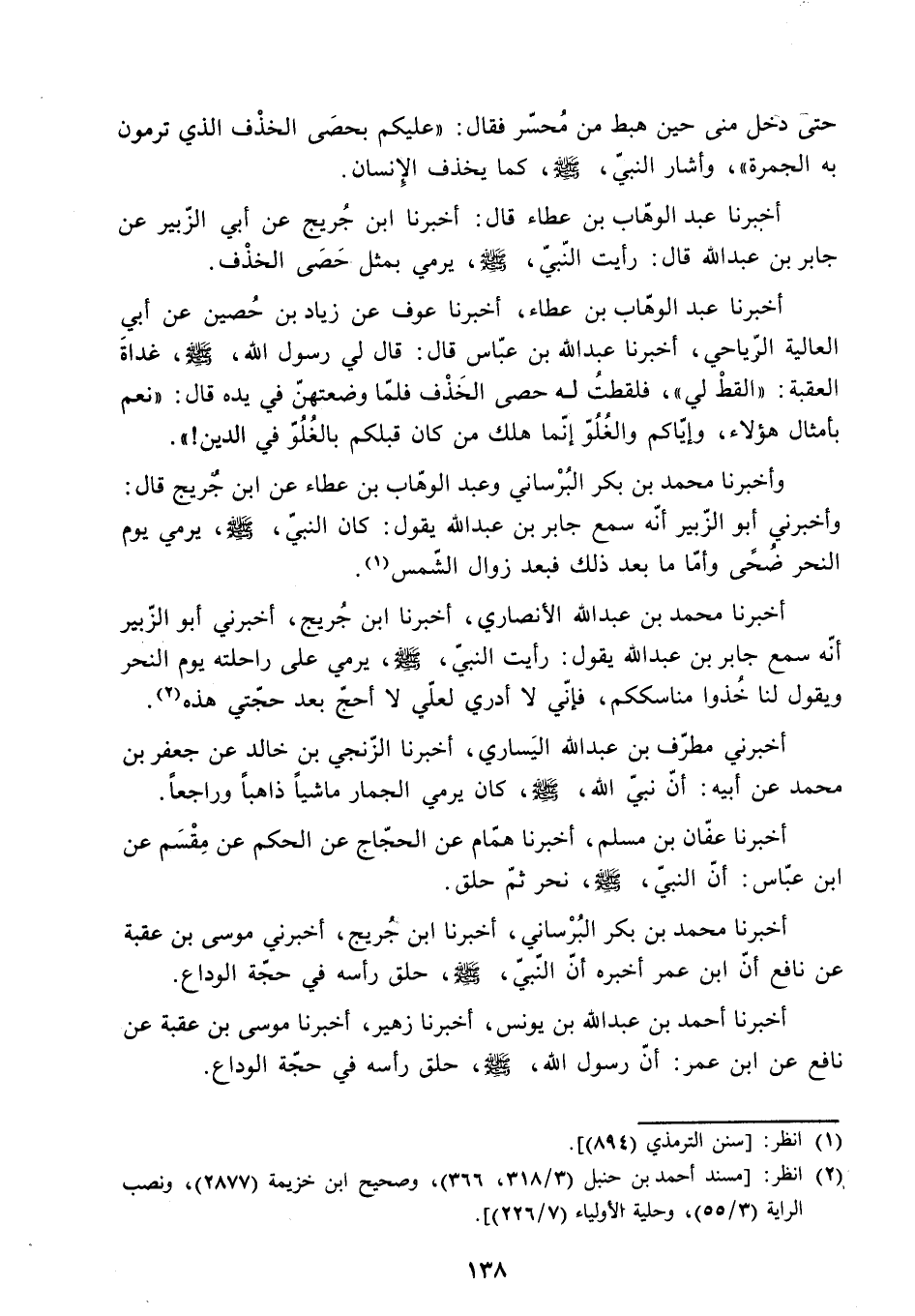 أَخْبَرَنَا عَبْدُ الْوَهَّابِ بْنُ عَطَاءٍ قَالَ: أَخْبَرَنَا ابْنُ جُرَيْجٍ عَنْ أَبِي الزُّبَيْرِ عَنْ جَابِرِ بْنِ عَبْدِ اللَّهِ قَالَ: رَأَيْتُ النَّبِيَّ - صَلَّى اللَّهُ عَلَيْهِ وَسَلَّمَ - يَرْمِي بِمِثْلِ حَصَى الْخَذْفِ.