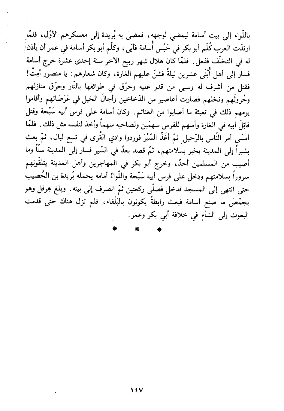 باللواء إلى بيت أسامة ليمضي لوجهه. فمضى بِهِ بريدة إلى معسكرهم الأول. فلما ارتدت العرب كلم أَبُو بَكْر فِي حبس أسامة فأبى. وكلم أبو بكر أسامة فِي عُمَر أن يأذن لَهُ فِي التخلف ففعل. فلما كَانَ هلال شهر ربيع الآخر سنة إحدى عشرة خرج أسامة فسار إلى أهل أبنى عشرين ليلة فشن عليهم الغارة. وكان شعارهم: يا منصور أمت! فقتل من أشرف لَهُ وسبى من قدر عَلَيْهِ وحرق فِي طوائفها بالنار وحرق منازلهم وحروثهم ونخلهم فصارت أعاصير من الدخاخين وأجال الخيل فِي عرصاتهم وأقاموا يومهم ذَلِكَ فِي تعبئة ما أصابوا من الغنائم. وكان أسامة عَلَى فرس أَبِيهِ سبحة وقتل قاتل أَبِيهِ فِي الغارة وأسهم للفرس سهمين ولصاحبه سهما وأخذ لنفسه مثل ذَلِكَ. فلما أمسى أمر النّاس بالرحيل ثُمَّ أغذ السير فوردوا وادي القرى فِي تسع ليال. ثُمَّ بعث بشيرا إلى المدينة يخبر بسلامتهم. ثُمَّ قصد بعد فِي السير فسار إلى المدينة ستا وما أصيب من المسلمين أحد. وخرج أَبُو بَكْر فِي المهاجرين وأهل المدينة يتلقونهم سرورا بسلامتهم ودخل عَلَى فرس أَبِيهِ سبحة واللواء أمامه يحمله بريدة بْن الحصيب حتى انتهى إلى المسجد فدخل فصلى ركعتين ثُمَّ انصرف إلى بيته. وبلغ هرقل وهو بحمص ما صنع أسامة فبعث رابطة يكونون بالبلقاء. فلم تزل هناك حتى قدمت البعوث إلى الشام فِي خلافة أبي بكر وعمر.