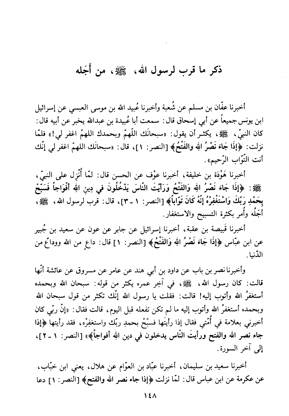 ص: «إِذا جاءَ نَصْرُ اللَّهِ وَالْفَتْحُ وَرَأَيْتَ النَّاسَ يَدْخُلُونَ فِي دِينِ اللَّهِ أَفْواجاً فَسَبِّحْ بِحَمْدِ رَبِّكَ وَاسْتَغْفِرْهُ إِنَّهُ كانَ تَوَّاباً» النصر: 1- 3. قَالَ: قَرُبَ لِرَسُولِ اللَّهِ - صَلَّى اللَّهُ عَلَيْهِ وَسَلَّمَ -