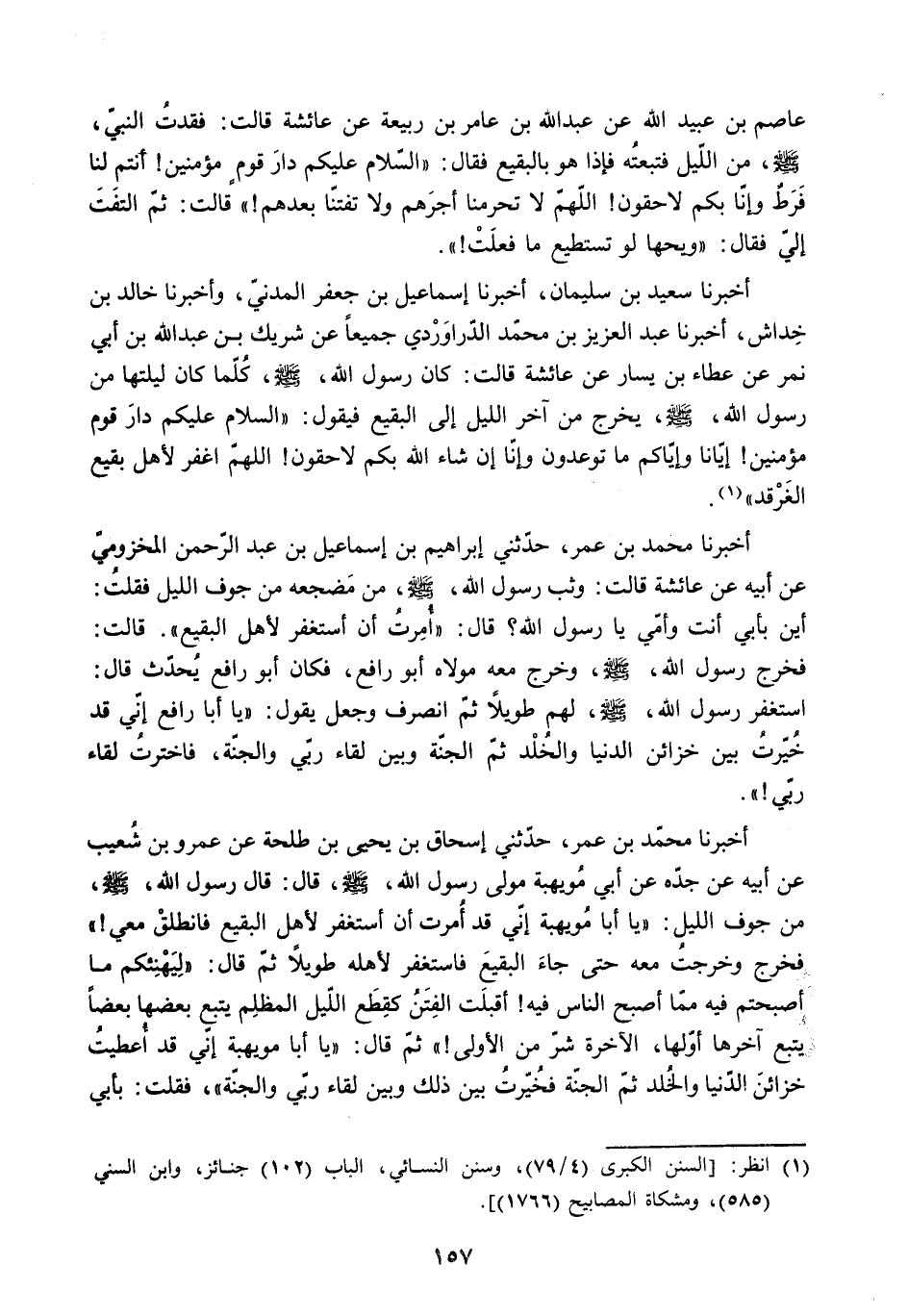 [أَخْبَرَنَا سَعِيدُ بْنُ سُلَيْمَانَ. أَخْبَرَنَا إِسْمَاعِيلُ بْنُ جَعْفَرٍ الْمَدَنِيُّ. وَأَخْبَرَنَا خَالِدُ بْنُ خِدَاشٍ. أَخْبَرَنَا عَبْدُ الْعَزِيزِ بْنُ مُحَمَّدٍ الدَّرَاوَرْدِيُّ جَمِيعًا عَنْ شَرِيكِ بْنِ عَبْدِ اللَّهِ بْنِ أَبِي نمر عَنْ عَطَاءِ بْنِ يَسَارٍ عَنْ عَائِشَةَ قَالَتْ: كَانَ رَسُولُ اللَّهِ - صَلَّى اللَّهُ عَلَيْهِ وَسَلَّمَ - كُلَّمَا كَانَ لَيْلَتُهَا مِنْ رَسُولِ اللَّهِ - صَلَّى اللَّهُ عَلَيْهِ وَسَلَّمَ - يَخْرُجُ مِنْ آخِرِ اللَّيْلِ إِلَى الْبَقِيعِ فَيَقُولُ: السَّلامُ عَلَيْكُمْ دَارَ قَوْمٍ مُؤْمِنِينَ! إِيَّانَا وَإِيَّاكُمْ مَا تُوعَدُونَ وَإِنَّا إِنْ شَاءَ اللَّهُ بِكُمْ لاحِقُونَ! اللَّهُمَّ اغْفِرْ لأَهْلِ بَقِيعِ الْغَرْقَدِ] «1» .
