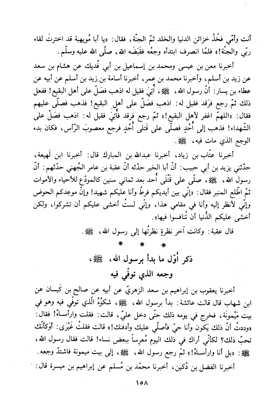 أَخْبَرَنَا مَعْنُ بْنُ عِيسَى وَمُحَمَّدُ بْنُ إِسْمَاعِيلَ بْنِ أَبِي فُدَيْكٍ عَنْ هِشَامِ بْنِ سَعْدٍ عَنْ زَيْدِ بْنِ أَسْلَمَ. وَأَخْبَرَنَا مُحَمَّدُ بْنُ عُمَرَ. أَخْبَرَنَا أُسَامَةُ بْنُ زَيْدِ بْنِ أَسْلَمَ عَنْ أَبِيهِ عَنْ عَطَاءِ بْنِ يَسَارٍ: أَنَّ رَسُولَ اللَّهِ - صَلَّى اللَّهُ عَلَيْهِ وَسَلَّمَ - أُتِيَ فَقِيلَ لَهُ اذْهَبْ فَصَلِّ عَلَى أَهْلِ الْبَقِيعِ! فَفَعَلَ ذَلِكَ ثُمَّ رَجَعَ فَرَقَدَ فَقِيلَ لَهُ: اذْهَبْ فَصَلِّ عَلَى أَهْلِ الْبَقِيعِ! فَذَهَبَ فَصَلَّى عَلَيْهِمْ فَقَالَ: اللَّهُمَّ اغْفِرْ لأَهْلِ الْبَقِيعِ! ثُمَّ رَجَعَ فَرَقَدَ فَأُتِيَ فَقِيلَ لَهُ: اذْهَبْ فَصَلِّ عَلَى الشُّهَدَاءِ! فَذَهَبَ إِلَى أُحُدٍ فَصَلَّى عَلَى قَتْلَى أُحُدٍ فَرَجَعَ مَعْصُوبَ الرَّأْسِ. فَكَانَ بَدْءُ الْوَجَعِ الَّذِي مَاتَ فِيهِ - صَلَّى اللَّهُ عَلَيْهِ وَسَلَّمَ -