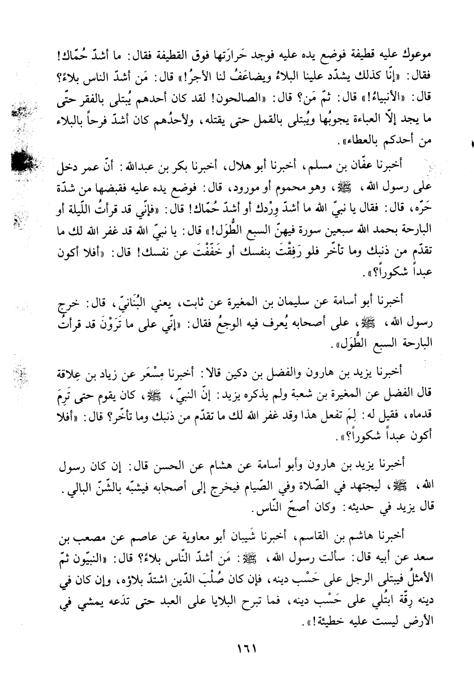 [أَخْبَرَنَا هَاشِمُ بْنُ الْقَاسِمِ. أَخْبَرَنَا شَيْبَانُ أَبُو مُعَاوِيَةَ عَنْ عَاصِمٍ عَنْ مُصْعَبِ بْنِ سَعْدٍ عَنْ أَبِيهِ قَالَ: سَأَلْتُ رَسُولَ الله. ص: مَنْ أَشَدُّ النَّاسِ بَلاءً؟ قَالَ: النَّبِيُّونَ ثُمَّ الأَمْثَلُ فَيُبْتَلَى الرَّجُلُ عَلَى حَسْبِ دِينِهِ. فَإِنْ كَانَ صُلْبَ الدِّينِ اشْتَدَّ بَلاؤُهُ. وَإِنْ كَانَ فِي دِينِهِ رِقَّةٌ ابْتُلِيَ عَلَى حَسْبِ دِينِهِ. فَمَا تَبْرَحُ الْبَلايَا عَلَى الْعَبْدِ حَتَّى تَدَعَهُ يَمْشِي فِي الأَرْضِ لَيْسَتْ عَلَيْهِ خَطِيئَةٌ!] .
