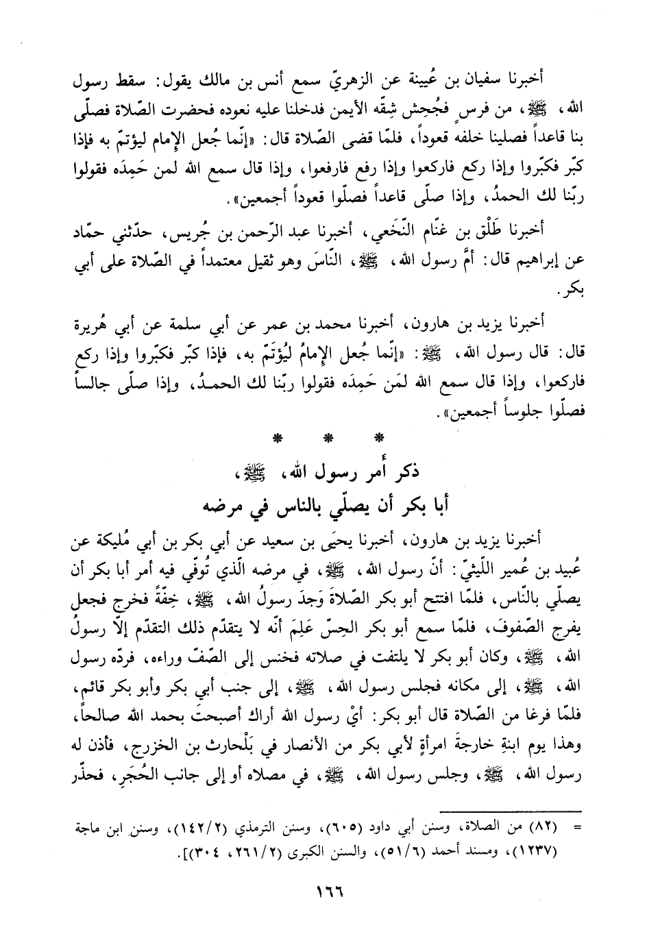 [أَخْبَرَنَا يَزِيدُ بْنُ هَارُونَ. أَخْبَرَنَا مُحَمَّدُ بْنُ عُمَرَ عَنْ أَبِي سَلَمَةَ عَنْ أَبِي هُرَيْرَةَ قَالَ: قَالَ رَسُولُ اللَّهِ. ص: إِنَّمَا جُعِلَ الإِمَامُ لِيُؤْتَمَّ بِهِ. فَإِذَا كَبَّرَ فَكَبِّرُوا وَإِذَا رَكَعَ فَارْكَعُوا. وَإِذَا قَالَ سَمِعَ الله لمن حمده فقولوا ربنا لك الْحَمْدُ. وَإِذَا صَلَّى جَالِسًا فَصَلُّوا جُلُوسًا أَجْمَعِينَ] .