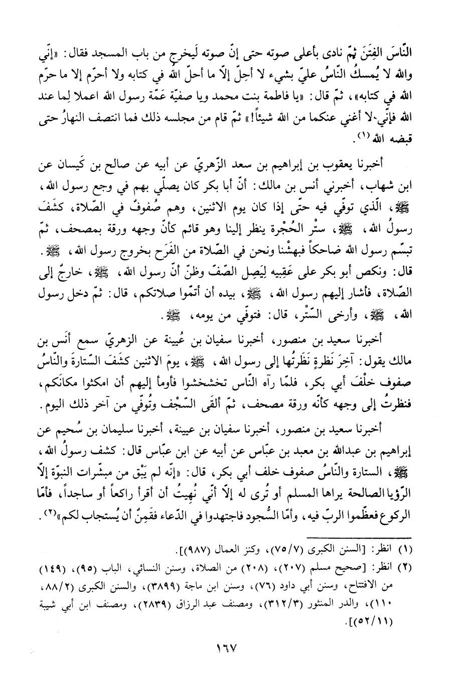 أَخْبَرَنَا سَعِيدُ بْنُ مَنْصُورٍ. أَخْبَرَنَا سُفْيَانُ بْنُ عُيَيْنَةَ عَنِ الزُّهْرِيِّ سَمِعَ أَنَسَ بْنَ مَالِكٍ يَقُولُ: آخِرُ نَظْرَةٍ نَظَرْتُهَا إِلَى رَسُولِ اللَّهِ - صَلَّى اللَّهُ عَلَيْهِ وَسَلَّمَ - يَوْمَ الاثْنَيْنِ كَشَفَ السِّتَارَةَ وَالنَّاسُ صُفُوفٌ خَلْفَ أَبِي بَكْرٍ. فَلَمَّا رَآهُ النَّاسُ تَخَشْخَشُوا فَأَوْمَأَ إِلَيْهِمْ أَنِ امْكُثُوا مَكَانَكُمْ.