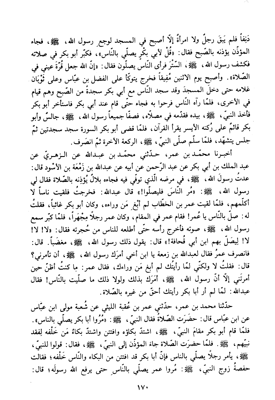 ص. يَأْمُرُ رَجُلا يُصَلِّي بِالنَّاسِ فَإِنَّ أَبَا بَكْرٍ قَدِ افْتُتِنَ مِنَ الْبُكَاءِ وَالنَّاسِ خَلْفَهُ. فَقَالَتْ حفصة زوج النبي. ص: مُرُوا عُمَرَ يُصَلِّي بِالنَّاسِ حَتَّى يَرْفَعَ اللَّهُ رسوله. قال:
