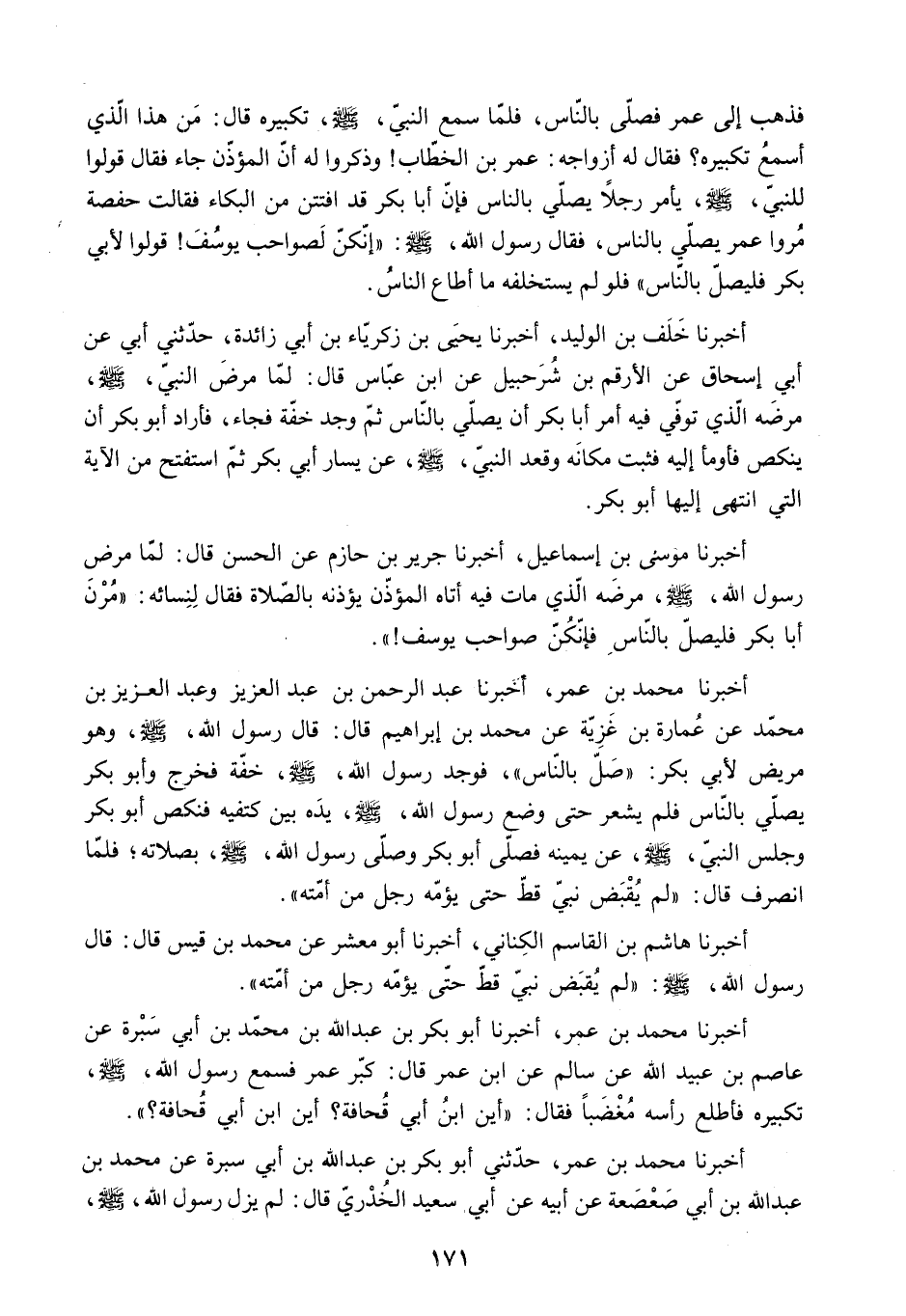 [أَخْبَرَنَا مُوسَى بْنُ إِسْمَاعِيلَ. أَخْبَرَنَا جَرِيرُ بْنُ حَازِمٍ عَنِ الْحَسَنِ قَالَ: لَمَّا مَرِضَ رَسُولُ اللَّهِ - صَلَّى اللَّهُ عَلَيْهِ وَسَلَّمَ - مَرَضَهُ الَّذِي مَاتَ فِيهِ أَتَاهُ الْمُؤَذِّنُ يُؤْذِنُهُ بِالصَّلاةِ فَقَالَ لِنِسَائِهِ: مُرْنَ أَبَا بَكْرٍ فَلْيُصَلِّ بِالنَّاسِ فَإِنَّكُنَّ صَوَاحِبُ يُوسُفَ!] .