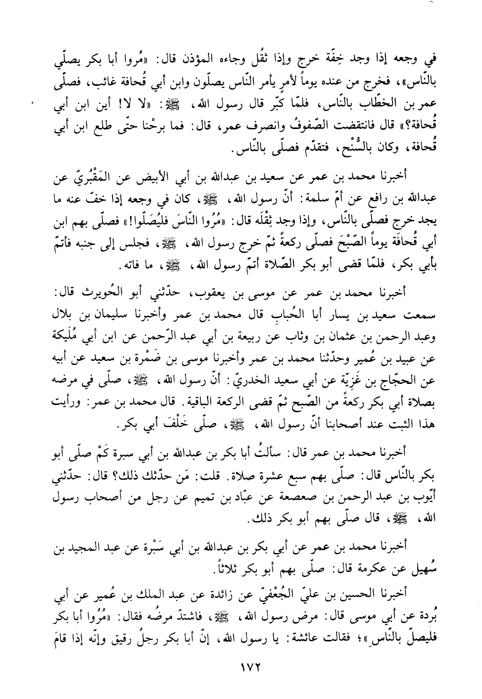 فِي وَجَعِهِ إِذَا وَجَدَ خِفَّةً خَرَجَ وَإِذَا ثَقُلَ وَجَاءَهُ الْمُؤَذِّنُ قَالَ: مُرُوا أَبَا بَكْرٍ يُصَلِّي بِالنَّاسِ. فَخَرَجَ مِنْ عِنْدِهِ يَوْمًا لأَمْرٍ يَأْمُرُ النَّاسَ يُصَلُّونَ وَابْنُ أَبِي قُحَافَةَ غَائِبٌ. فَصَلَّى عُمَرُ بْنُ الْخَطَّابِ بِالنَّاسِ. فَلَمَّا كَبَّرَ قال رسول الله. ص: لا لا! أَيْنَ ابْنُ أَبِي قُحَافَةَ؟ قَالَ فَانْتُقِضَتِ الصُّفُوفُ وَانْصَرَفَ عُمَرُ. قَالَ: فَمَا بَرَحْنَا حَتَّى طَلَعَ ابْنُ أَبِي قُحَافَةَ. وَكَانَ بِالسُّنْحِ. فَتَقَدَّمَ فَصَلَّى بِالنَّاسِ] .