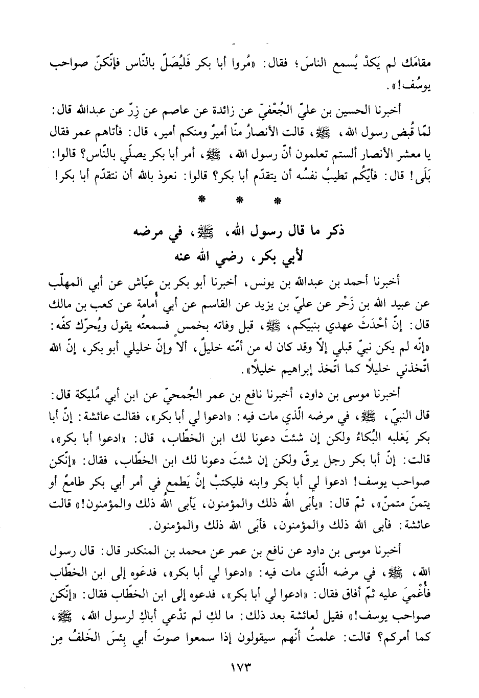 [أَخْبَرَنَا مُوسَى بْنُ دَاوُدَ عَنْ نَافِعِ بْنِ عُمَرَ عَنْ مُحَمَّدِ بْنِ الْمُنْكَدِرِ قَالَ: قَالَ رَسُولُ اللَّهِ - صَلَّى اللَّهُ عَلَيْهِ وسلم - في مرضه الذي مات فيه: ادعوا لي أبا بكر. فدعوه إلى ابْنَ الْخَطَّابِ فَأُغْمِيَ عَلَيْهِ ثُمَّ أَفَاقَ فَقَالَ: ادعوا لي أبا بكر. فدعوه إلى ابْنَ الْخَطَّابِ فَقَالَ: إِنَّكُنَّ صَوَاحِبَ يُوسُفَ! فَقِيلَ لِعَائِشَةَ بَعْدَ ذَلِكَ: مَا لَكِ لَمْ تَدْعِي أَبَاكِ لِرَسُولِ اللَّهِ - صَلَّى اللَّهُ عَلَيْهِ وَسَلَّمَ -