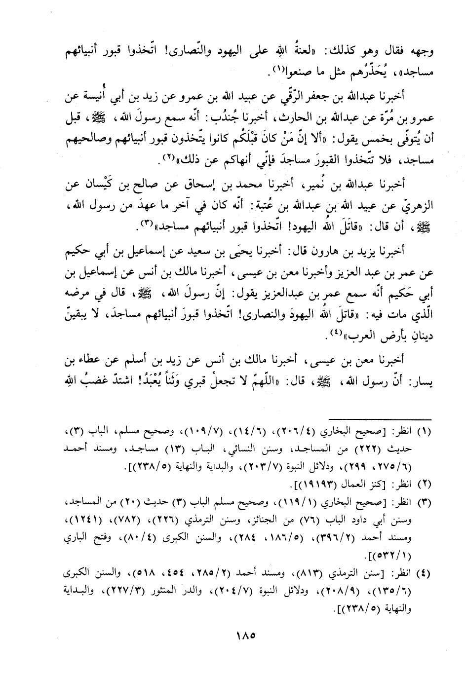 [أَخْبَرَنَا عَبْدُ اللَّهِ بْنُ جَعْفَرٍ الرَّقِّيُّ عَنْ عُبَيْدِ اللَّهِ بْنِ عَمْرٍو عَنْ زَيْدِ بْنِ أَبِي أُنَيْسَةَ عَنْ عَمْرِو بْنِ مُرَّةَ عَنْ عَبْدِ اللَّهِ بْنِ الْحَارِثِ. أَخْبَرَنَا جُنْدُبٌ: أَنَّهُ سَمِعَ رَسُولَ اللَّهِ - صَلَّى اللَّهُ عَلَيْهِ وَسَلَّمَ - قَبْلَ أَنْ يُتَوَفَّى بِخَمْسٍ يَقُولُ: أَلا إِنَّ مَنْ كَانَ قَبْلَكُمْ كَانُوا يَتَّخِذُونَ قُبُورَ أَنْبِيَائِهِمْ وَصَالِحِيهِمْ مَسَاجِدَ. فَلا تَتَّخِذُوا الْقُبُورَ مَسَاجِدَ فَإِنِّي أَنْهَاكُمْ عَنْ ذَلِكَ] «2» .