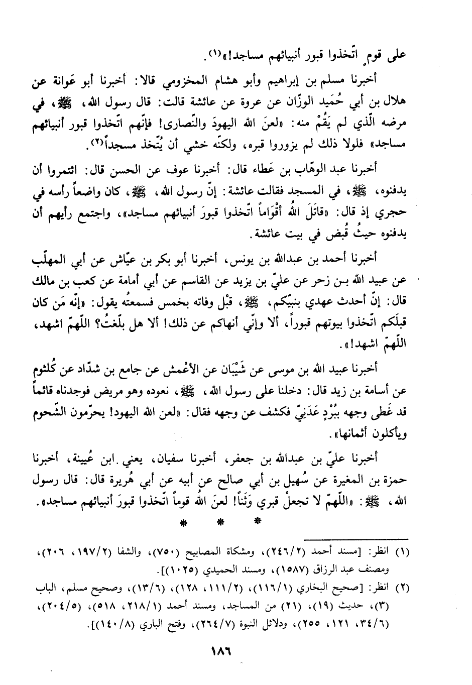 [أَخْبَرَنَا عَلِيُّ بْنُ عَبْدِ اللَّهِ بْنِ جَعْفَرٍ. أَخْبَرَنَا سُفْيَانُ. يَعْنِي ابْنَ عُيَيْنَةَ. أَخْبَرَنَا حَمْزَةُ بْنُ الْمُغِيرَةِ عَنْ سُهَيْلِ بْنِ أَبِي صَالِحٍ عَنْ أَبِيهِ عَنْ أَبِي هُرَيْرَةَ قَالَ: قَالَ رَسُولُ اللَّهِ. ص: اللَّهُمَّ لا تَجْعَلْ قَبْرِي وَثَنًا! لَعَنَ اللَّهُ قوما اتخذوا قبور أنبيائهم مساجد] .