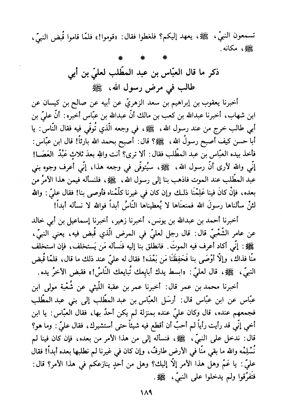 فَأَخَذَ بِيَدِهِ الْعَبَّاسُ بْنُ عَبْدِ الْمُطَّلِبِ فَقَالَ: أَلا تَرَى؟ أَنْتَ وَاللَّهِ بَعْدَ ثَلاثٍ عبد العصا! إني والله لأرى أن رسول الله - صلى الله عليه وسلم - سَيُتَوَفَّى فِي وَجَعِهِ هَذَا. إِنِّي أَعْرِفُ وُجُوهَ بَنِي عَبْدِ الْمُطَّلِبِ عِنْدَ الْمَوْتِ فَاذْهَبْ بِنَا إلى رسول الله - صلى الله عليه وسلم - فَلْنَسْأَلْهُ فِيمَنْ هَذَا الأَمْرُ مِنْ بَعْدِهِ. فَإِنْ كَانَ فِينَا عَلِمْنَا ذَلِكَ وَإِنْ كَانَ فِي غَيْرِنَا كَلَّمْنَاهُ فَأَوْصَى بِنَا! فَقَالَ عَلِيٌّ: وَاللَّهِ لَئِنْ سَأَلْنَاهَا رَسُولَ اللَّهِ فَمَنَعَنَاهَا لا يُعْطِيَنَّاهَا الناس أبدا فو الله لا نَسْأَلُهُ أَبَدًا!] أَخْبَرَنَا أَحْمَدُ بْنُ عَبْدِ اللَّهِ بْنِ يُونُسَ. أَخْبَرَنَا زُهَيْرٌ. أَخْبَرَنَا إِسْمَاعِيلُ بْنُ أَبِي خَالِدٍ عَنْ عَامِرٍ الشَّعْبِيِّ قَالَ: قَالَ رَجُلٌ لِعَلِيٍّ فِي الْمَرَضِ الَّذِي قُبِضَ فيه. يعني النبي.