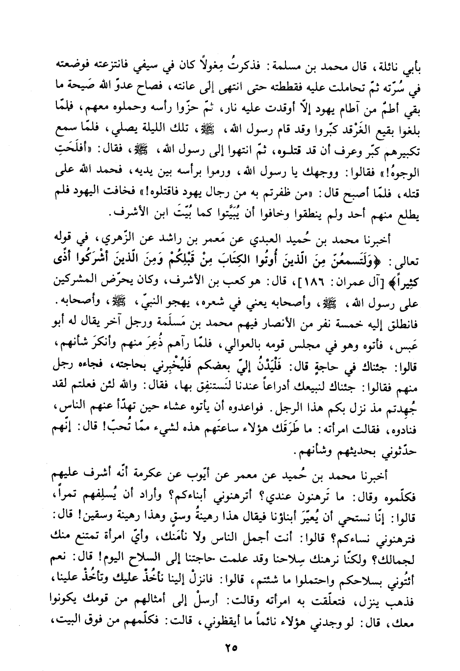 أَخْبَرَنَا مُحَمَّدُ بْنُ حُمَيْدٍ الْعَبْدِيُّ عَنْ مَعْمَرٍ بْنِ رَاشِدٍ عَنِ الزُّهْرِيِّ. فِي قَوْلِهِ تَعَالَى: «وَلَتَسْمَعُنَّ مِنَ الَّذِينَ أُوتُوا الْكِتابَ مِنْ قَبْلِكُمْ وَمِنَ الَّذِينَ أَشْرَكُوا أَذىً كَثِيراً» آل عمران: 186. قَالَ: هُوَ كَعْبُ بْنُ الأَشْرَفِ. وَكَانَ يُحَرِّضُ الْمُشْرِكِينَ عَلَى رَسُولِ اللَّهِ - صَلَّى اللَّهُ عَلَيْهِ وَسَلَّمَ - وَأَصْحَابِهِ يَعْنِي فِي شِعْرِهِ. يَهْجُو النَّبِيَّ - صَلَّى اللَّهُ عَلَيْهِ وَسَلَّمَ - وَأَصْحَابَهُ.
