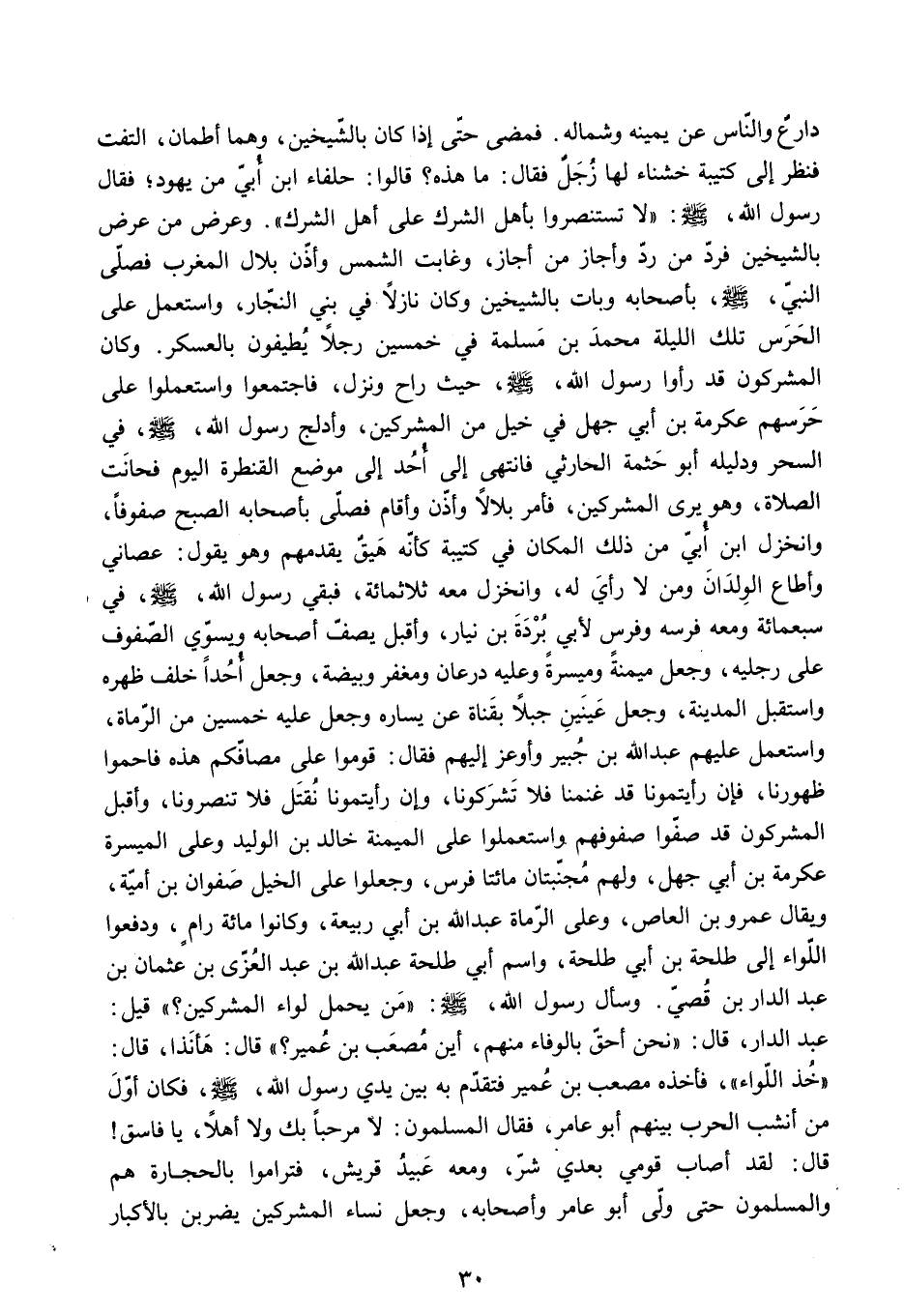 دارع والناس عن يمينه وشماله. فمضى حتى إذا كَانَ بالشيخين. وهما أطمان. التفت فنظر إلى كتيبة خشناء لها زجل فَقَالَ: ما هذه؟ قَالُوا: حلفاء ابن أَبِي مِن يهود. [فقال رسول الله. ص: لا تستنصروا بأهل الشرك على أهل الشرك] . وعرض من عرض بالشيخين فرد مِن رد وأجاز مِن أجاز. وغابت الشمس وأذن بلال المغرب فصلى النَّبِيّ - صَلَّى اللَّهُ عَلَيْهِ وَسَلَّمَ - بأصحابه وبات بالشيخين وكان نازلا فِي بني النّجّار. واستعمل على الحرس تلك الليلة مُحَمَّد بْن مسلمة فِي خمسين رجلا يطيفون بالعسكر. وكان المشركون قد رأوا رسول الله - صَلَّى اللَّهُ عَلَيْهِ وَسَلَّمَ - حيث راح ونزل. فاجتمعوا واستعملوا على حرسهم عكرمة بن أبي جهل في خيل من المشركين. وأدلج رسول الله - صلى الله عليه وسلم - في السحر ودليله أَبُو حثمة الحارثي فانتهى إلى أحد إلى موضع القنطرة اليوم فحانت الصلاة. وهو يرى المشركين. فأمر بلالا وأذن وأقام فصلى بأصحابه الصبح صفوفا.