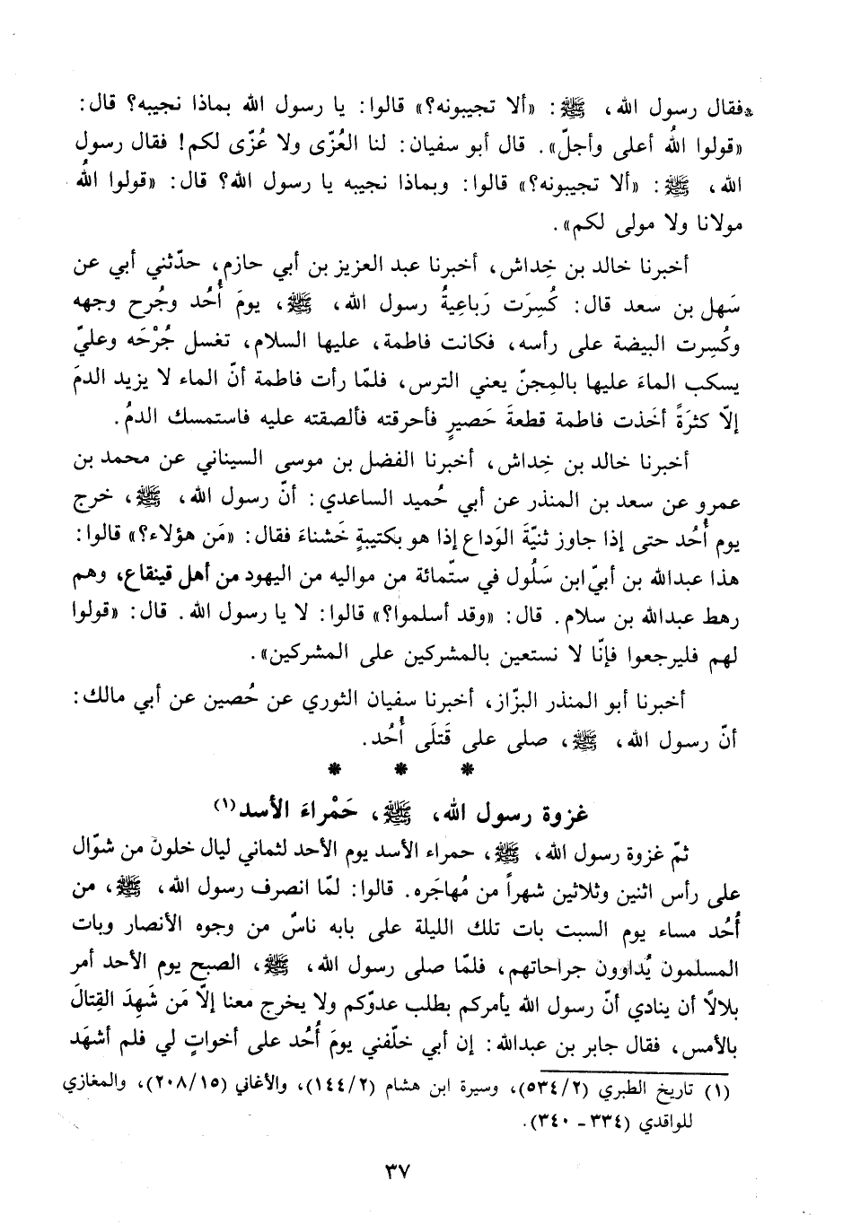 أَخْبَرَنَا خَالِدُ بْنُ خِدَاشٍ. أَخْبَرَنَا عَبْدُ الْعَزِيزِ بْنُ أَبِي حَازِمٍ. حَدَّثَنِي أَبِي عَنْ سَهْلِ بْنِ سَعْدٍ قَالَ: كُسِرَتْ رَبَاعِيَةُ رَسُولِ اللَّهِ - صَلَّى اللَّهُ عَلَيْهِ وَسَلَّمَ - يَوْمَ أُحُدٍ وَجُرِحَ وَجْهُهُ وَكُسِرَتِ الْبَيْضَةُ عَلَى رَأْسِهِ. فَكَانَتْ فاطمة. ع. تَغْسِلُ جُرْحَهُ وَعَلِيٌّ يَسْكُبُ الْمَاءَ عَلَيْهَا بِالْمِجَنِّ يَعْنِي التُّرْسَ. فَلَمَّا رَأَتْ فَاطِمَةُ أَنَّ الْمَاءَ لا يَزِيدُ الدَّمَ إِلا كَثْرَةً أَخَذَتْ فَاطِمَةُ قِطْعَةَ حَصِيرٍ فَأَحْرَقَتْهُ فَأَلْصَقَتْهُ عَلَيْهِ فَاسْتَمْسَكَ الدَّمُ.