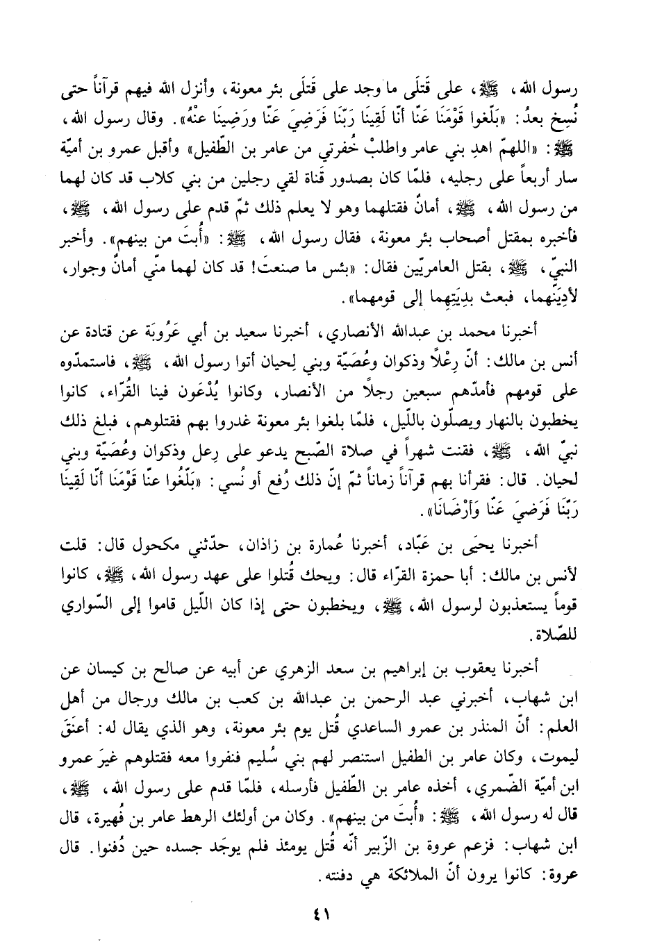 أَخْبَرَنَا مُحَمَّدُ بْنُ عَبْدِ اللَّهِ الأَنْصَارِيُّ. أَخْبَرَنَا سَعِيدُ بْنُ أَبِي عَرُوبَةَ عَنْ قَتَادَةَ عَنْ أَنَسِ بْنِ مَالِكٍ: أَنَّ رِعْلا وَذَكْوَانَ وَعُصَيَّةَ وَبَنِي لِحْيَانَ أَتَوْا رَسُولَ اللَّهِ - صَلَّى اللَّهُ عَلَيْهِ وَسَلَّمَ - فَاسْتَمَدُّوهُ عَلَى قَوْمِهِمْ فَأَمَدَّهُمْ سبعين رجلا من الأنصار. وكانوا يدعون فينا القراء. كانوا يحطبون بِالنَّهَارِ وَيُصَلُّونَ بِاللَّيْلِ. فَلَمَّا بَلَغُوا بِئْرَ مَعُونَةَ غَدَرُوا بِهِمْ فَقَتَلُوهُمْ. فَبَلَغَ ذَلِكَ نَبِيَّ اللَّهِ - صَلَّى اللَّهُ عَلَيْهِ وَسَلَّمَ - فَقَنَتَ شَهْرًا فِي صَلاةِ الصُّبْحِ يَدْعُو عَلَى رِعْلٍ وَذَكْوَانَ وَعُصَيَّةَ وَبَنِي لِحْيَانَ. قَالَ: فَقَرَأْنَا بِهِمْ قُرْآنًا زَمَانًا ثُمَّ إِنَّ ذَلِكَ رُفِعَ أَوْ نُسِيَ: بَلِّغُوا عَنَّا قَوْمَنَا أَنَا لَقِينَا رَبَّنَا فَرَضِيَ عَنَّا وَأَرْضَانَا.