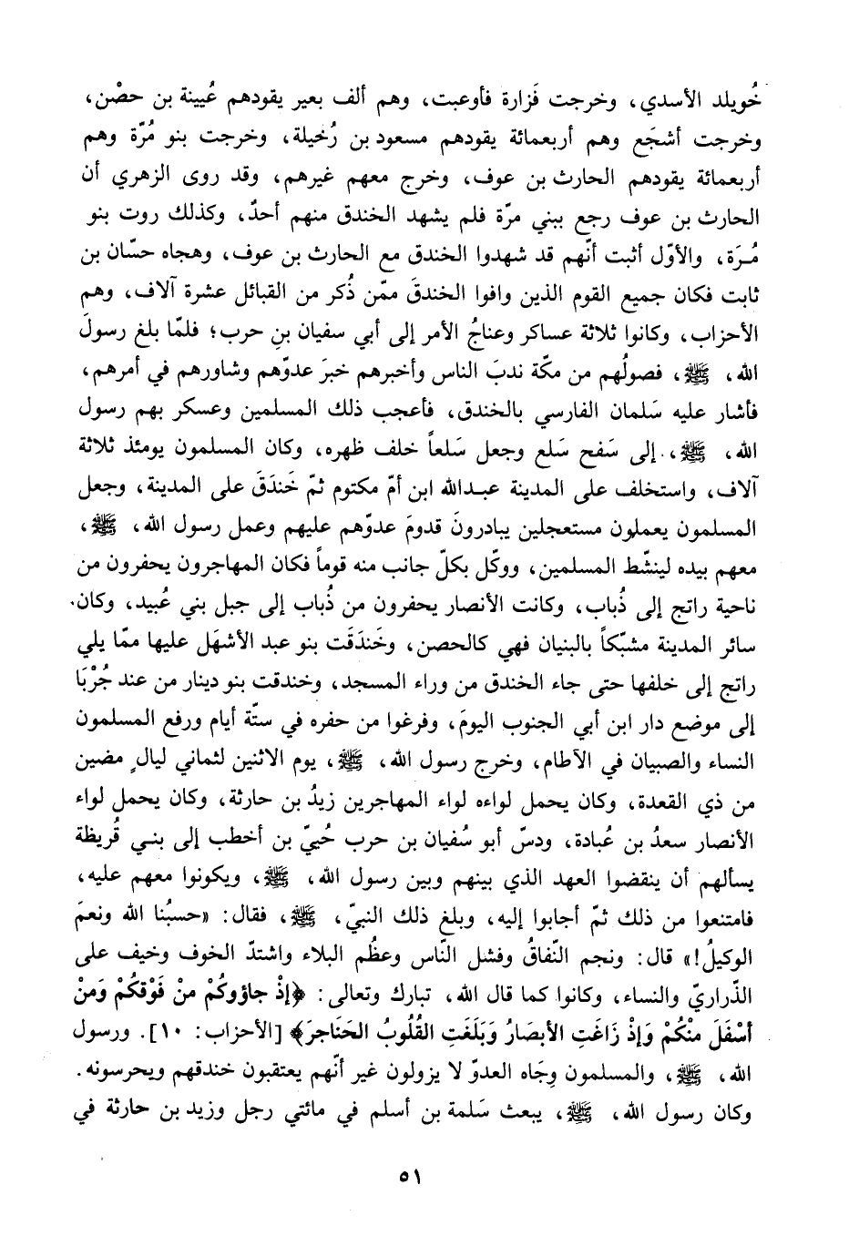 فامتنعوا مِن ذَلِكَ ثُمَّ أجابوا إِلَيْهِ. [وبلغ ذَلِكَ النَّبِيّ - صَلَّى اللَّهُ عَلَيْهِ وَسَلَّمَ - فَقَالَ: حسبنا اللَّه ونعم الوكيل!] قَالَ: ونجم النفاق وفشل النّاس وعظم البلاء واشتد الخوف وخيف عَلَى الذراري والنساء. وكانوا كما قَالَ اللَّه. تبارك وتعالى: «إِذْ جاؤُكُمْ مِنْ فَوْقِكُمْ وَمِنْ أَسْفَلَ مِنْكُمْ وَإِذْ زاغَتِ الْأَبْصارُ وَبَلَغَتِ الْقُلُوبُ الْحَناجِرَ» الأحزاب: 10. ورسول اللَّه - صَلَّى اللَّهُ عَلَيْهِ وَسَلَّمَ - والمسلمون وجاه العدو لا يزولون غير أنهم يعتقبون خندقهم ويحرسونه.