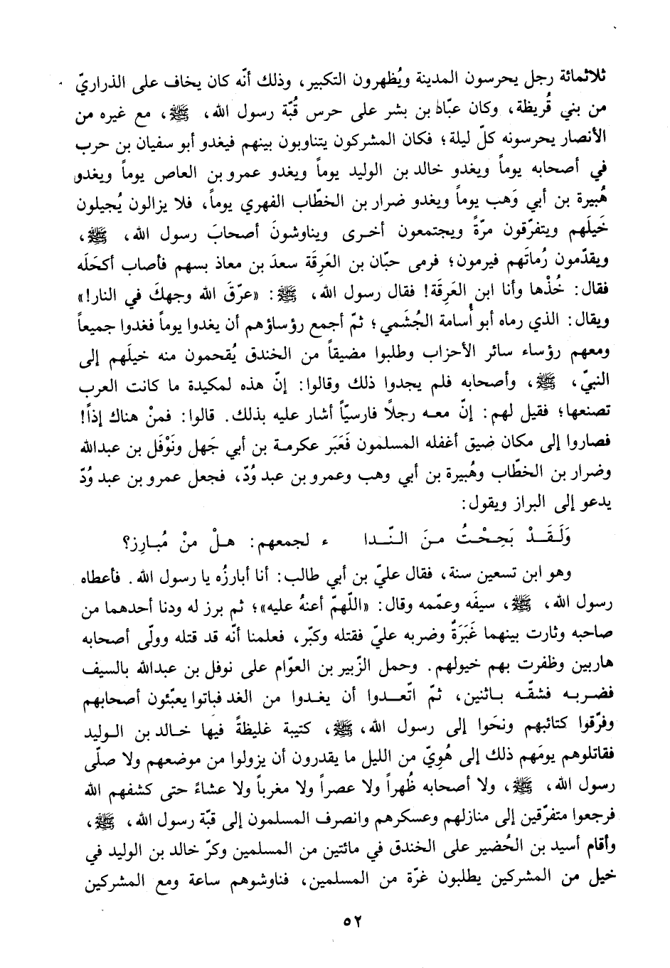 وهو ابن تسعين سنة. فَقَالَ عَلِيّ بْن أَبِي طالب: أَنَا أبارزه يا رَسُول اللَّهِ. فَأَعْطَاهُ [رَسُولُ اللَّهِ - صَلَّى اللَّهُ عَلَيْهِ وَسَلَّمَ - سيفه وعممه وَقَالَ: اللهم أعنه عَلَيْهِ. ثُمَّ] برز لَهُ ودنا أحدهما مِن صاحبه وثارت بينهما غبرة وضربه عَلِيّ فقتله وكبر. فعلمنا أَنَّهُ قد قتله وولى أصحابه هاربين وظفرت بهم خيولهم. وحمل الزبير بْن الْعَوّام عَلَى نوفل بْن عَبْد اللَّه بالسيف فضربه فشقه باثنين. ثُمَّ اتعدوا أن يغدوا مِن الغد فباتوا يعبئون أصحابهم وفرقوا كتائبهم ونحوا إلى رسول اللَّه - صَلَّى اللَّهُ عَلَيْهِ وَسَلَّمَ - كتيبة غليظة فيها خالد بْن الوليد فقاتلوهم يومهم ذَلِكَ إلى هوي مِن الليل ما يقدرون أن يزولوا مِن موضعهم ولا صَلَّى رَسُول اللَّهِ - صَلَّى اللَّهُ عَلَيْهِ وَسَلَّمَ - وَلا أصحابه ظهرا ولا عصرا ولا مغربا ولا عشاء حتى كشفهم اللَّه فرجعوا متفرقين إلى منازلهم وعسكرهم وانصرف المسلمون إلى قبة رَسُول اللَّهِ - صَلَّى اللَّهُ عَلَيْهِ وَسَلَّمَ -