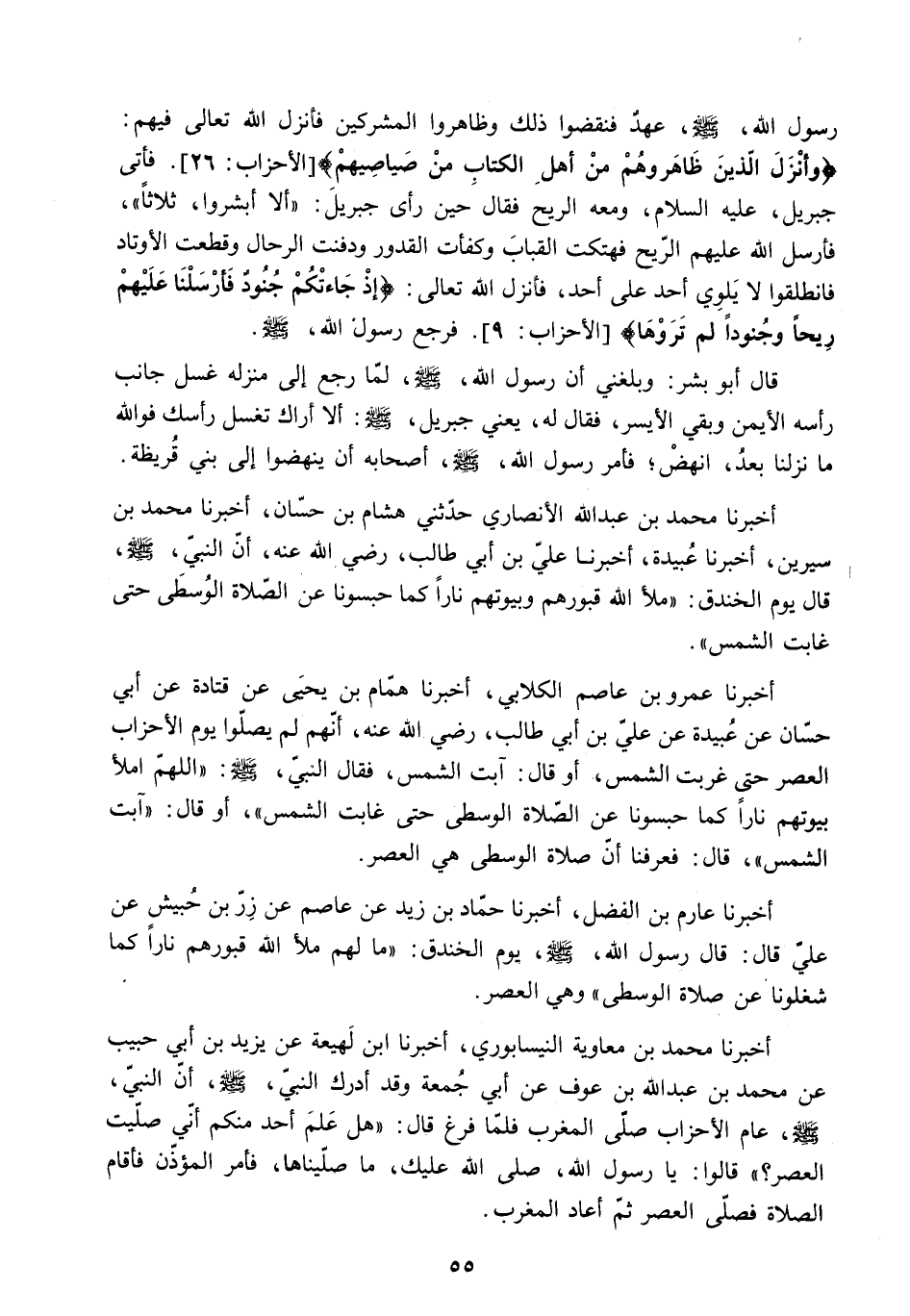 أَخْبَرَنَا عَمْرُو بْنُ عَاصِمٍ الْكِلابِيُّ. أَخْبَرَنَا هَمَّامُ بْنُ يَحْيَى عَنْ قَتَادَةَ عَنْ أَبِي حَسَّانَ عَنْ عُبَيْدَةَ عَنْ عَلِيِّ بْنِ أبي طالب. رضي الله عَنْهُ. أَنَّهُمْ لَمْ يُصَلُّوا يَوْمَ الأَحْزَابِ الْعَصْرَ حَتَّى غَرَبَتِ الشَّمْسُ. أَوْ قَالَ: آبَتِ الشَّمْسُ. [فقال النبي. ص: اللَّهُمَّ امْلأْ بُيُوتَهُمْ نَارًا كَمَا حَبَسُونَا عَنِ الصَّلاةِ الْوُسْطَى حَتَّى غَابَتِ الشَّمْسُ. أَوْ قَالَ: آبَتِ الشَّمْسُ. قَالَ: فَعَرَفْنَا أَنَّ صَلاةَ الْوُسْطَى هِيَ الْعَصْرُ] .