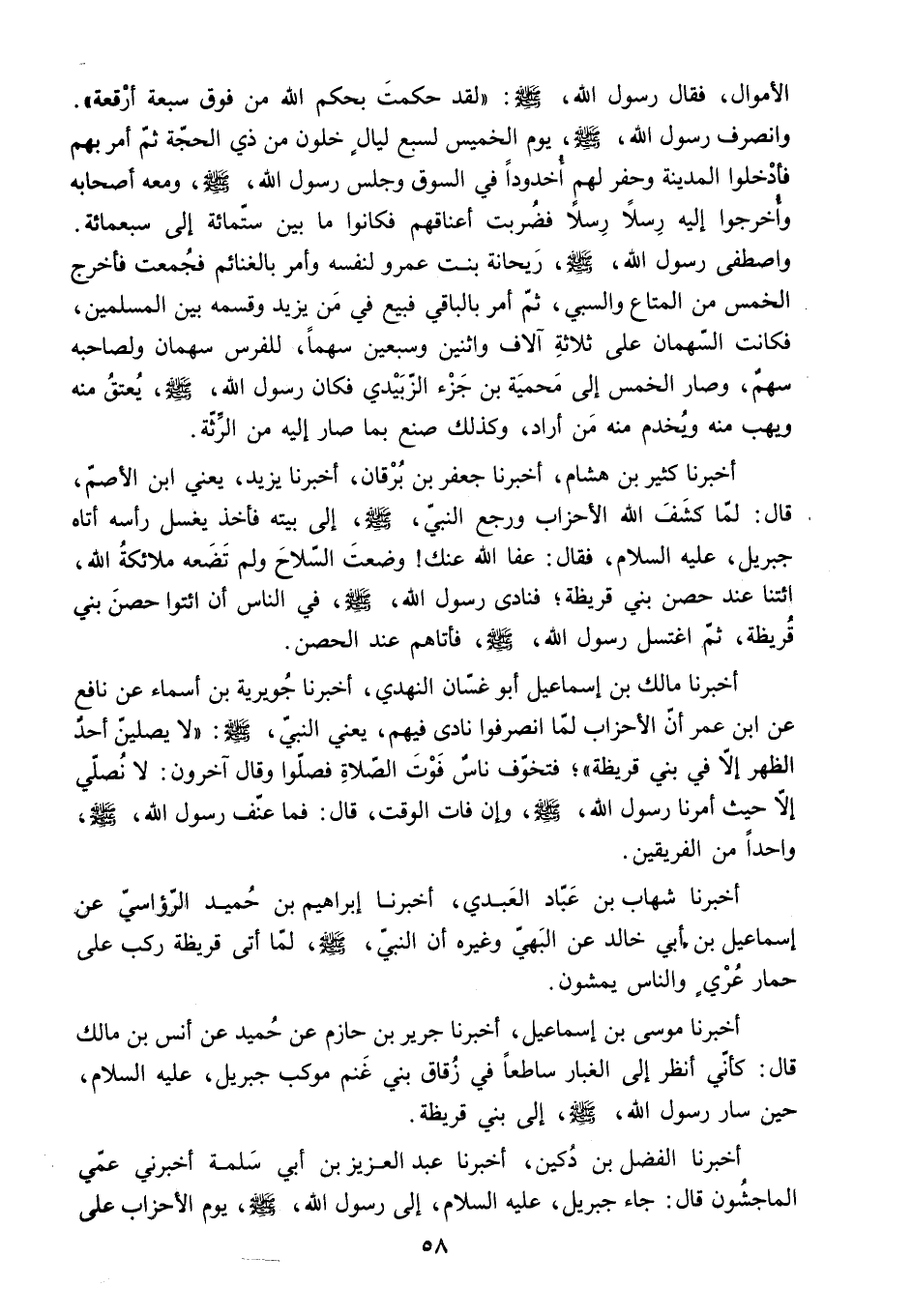 أَخْبَرَنَا شِهَابُ بْنُ عَبَّادٍ الْعَبْدِيُّ. أَخْبَرَنَا إِبْرَاهِيمُ بْنُ حُمَيْدٍ الرُّؤَاسِيُّ عَنْ إِسْمَاعِيلَ بْنِ أَبِي خَالِدٍ عَنِ الْبَهِيِّ وَغَيْرِهِ أَنَّ النَّبِيَّ - صَلَّى اللَّهُ عَلَيْهِ وَسَلَّمَ - لَمَّا أَتَى قُرَيْظَةَ رَكِبَ عَلَى حِمَارٍ عَرِيٍّ وَالنَّاسُ يَمْشُونَ.