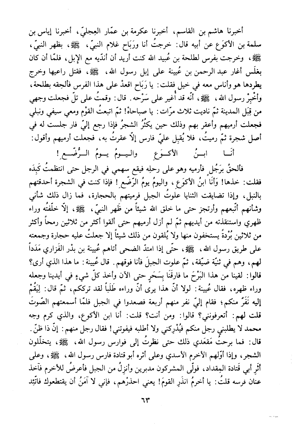 فَأَلْحَقُ بِرَجُلٍ فَأَرْمِيهِ وَهُوَ عَلَى رَحْلِهِ فَيَقَعُ سَهْمِي فِي الرَّجُلِ حَتَّى انْتَظَمْتُ كَبِدَهُ فَقُلْتُ: خُذْهَا! وَأَنَا ابْنُ الأَكْوَعْ. وَالْيَوْمُ يَوْمُ الرُّضَّعْ! فَإِذَا كُنْتُ فِي الشَّجَرَةِ أَحْدَقْتُهُمْ بِالنَّبْلِ. وَإِذَا تَضَايَقَتِ الثَّنَايَا عَلَوْتُ الْجَبَلَ فَرَمَيْتُهُمْ بِالْحِجَارَةِ. فَمَا زَالَ ذَلِكَ شَأْنِي وَشَأْنَهُمْ أَتَّبِعُهُمْ وَأَرْتَجِزُ حَتَّى مَا خَلَقَ اللَّهُ شَيْئًا مِنْ ظَهْرِ النَّبِيِّ - صَلَّى اللَّهُ عَلَيْهِ وَسَلَّمَ - إِلا خَلَّفْتُهُ وَرَاءَ ظَهْرِي وَاسْتَنْقَذْتُهُ مِنْ أَيْدِيهِمْ ثُمَّ لَمْ أَزَلْ أَرْمِيهِمْ حَتَّى أَلْقَوْا أَكْثَرَ مِنْ ثَلاثِينَ رُمْحًا وَأَكْثَرَ مِنْ ثَلاثِينَ بُرْدَةً يَسْتَخِفُّونَ مِنْهَا وَلا يُلْقُونَ مِنْ ذَلِكَ شَيْئًا إِلا جَعَلْتُ عَلَيْهِ حِجَارَةً وَجَمَعْتُهُ عَلَى طَرِيقِ رَسُولِ اللَّهِ - صَلَّى اللَّهُ عَلَيْهِ وَسَلَّمَ - حَتَّى إذا امْتَدَّ الضُّحَى أَتَاهُمْ عُيَيْنَةُ بْنُ بَدْرٍ الْفَزَارِيُّ مَدَدًا لَهُمْ. وَهُمْ فِي ثَنِيَّةٍ ضَيِّقَةٍ. ثُمَّ عَلَوْتُ الْجَبَلَ فَأَنَا فَوْقَهُمْ. قَالَ عُيَيْنَةُ: مَا هَذَا الَّذِي أَرَى؟