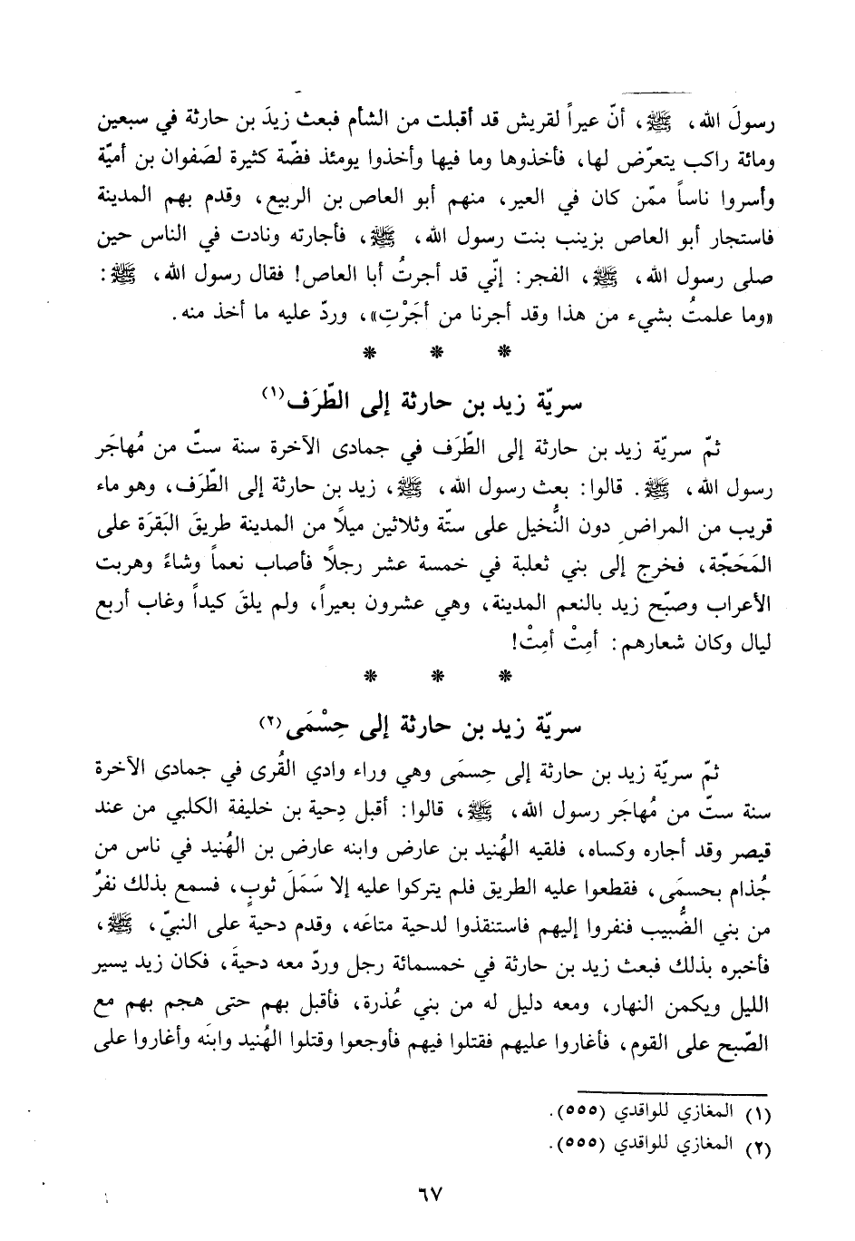ثُمَّ سرية زيد بْن حارثة إلى حسمى وهي وراء وادي القرى فِي جمادى الآخرة سنة ست مِن مهاجر رَسُولِ اللَّهِ - صَلَّى اللَّهُ عَلَيْهِ وَسَلَّمَ - قَالُوا: أقبل دحية بْن خليفة الكلبي مِن عند قيصر وقد أجاره وكساه. فلقيه الهنيد بْن عارض وابنه عارض بْن الهنيد فِي ناس مِن جذام بحسمى. فقطعوا عَلَيْهِ الطريق فلم يتركوا عَلَيْهِ إلا سمل ثوب. فسمع بذلك نفر مِن بني الضبيب فنفروا إليهم فاستنقذوا لدحية متاعه. وقدم دحية عَلَى النَّبِيّ - صَلَّى اللَّهُ عَلَيْهِ وَسَلَّمَ -