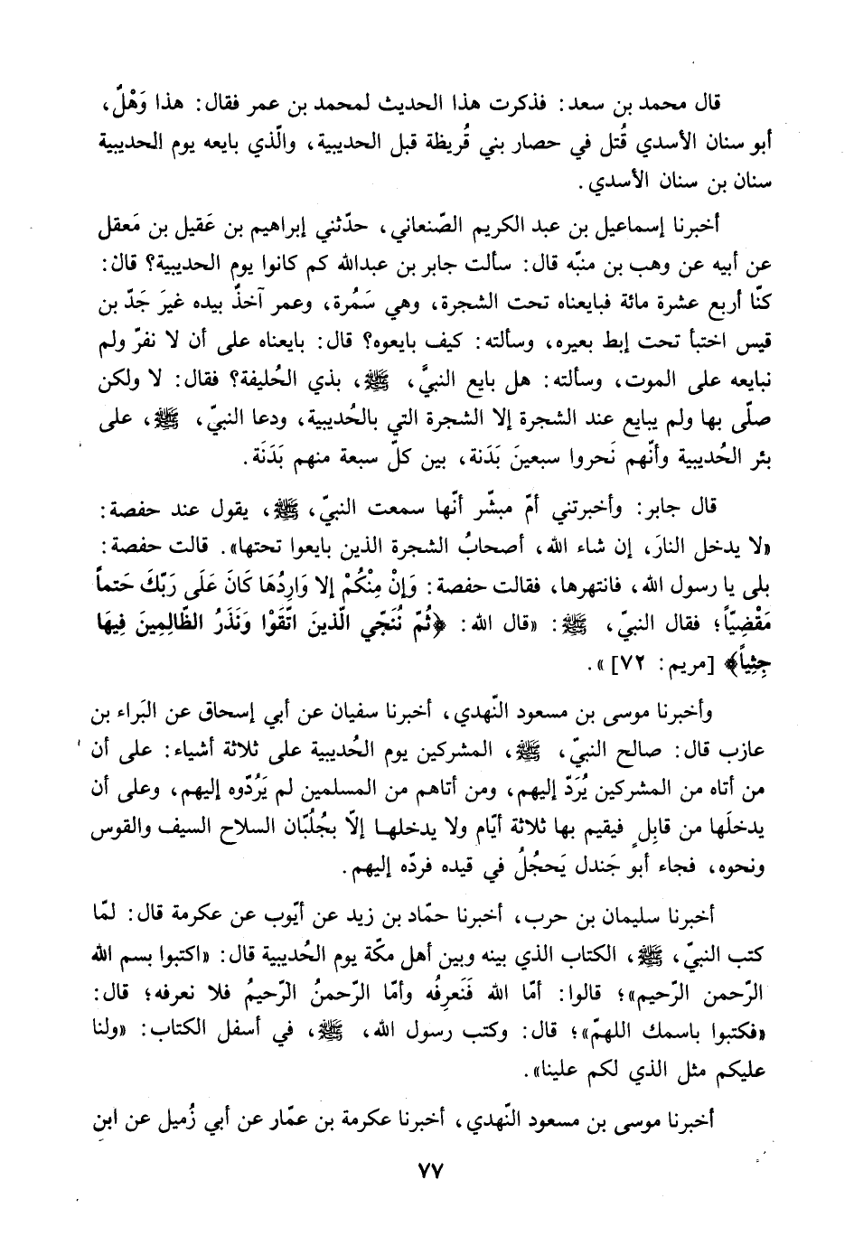 كُنَّا أَرْبَعَ عَشْرَةَ مِائَةً فَبَايَعْنَاهُ تَحْتَ الشَّجَرَةِ. وَهِيَ سَمُرَةٌ. وَعُمَرُ آخِذٌ بِيَدِهِ غَيْرَ جَدِّ بْنِ قَيْسٍ اخْتَبَأَ تَحْتَ إِبِطِ بَعِيرِهِ. وَسَأَلْتُهُ: كَيْفَ بَايَعُوهُ؟ قَالَ: بَايَعْنَاهُ عَلَى أَنْ لا نَفِرَّ وَلَمْ نُبَايِعْهُ عَلَى الْمَوْتِ. وَسَأَلْتُهُ: هَلْ بَايَعَ النَّبِيُّ - صَلَّى اللَّهُ عَلَيْهِ وَسَلَّمَ - بِذِي الْحُلَيْفَةِ؟ فَقَالَ: لا وَلَكِنْ صَلَّى بِهَا وَلَمْ يُبَايِعْ عِنْدَ الشَّجَرَةِ إِلا الشَّجَرَةِ الَّتِي بِالْحُدَيْبِيَةِ. وَدَعَا النَّبِيُّ - صَلَّى اللَّهُ عَلَيْهِ وَسَلَّمَ - عَلَى بِئْرِ الْحُدَيْبِيَةِ وَأَنَّهُمْ نَحَرُوا سَبْعِينَ بَدَنَةً. بَيْنَ كُلِّ سَبْعَةٍ مِنْهُمْ بَدَنَةً.
